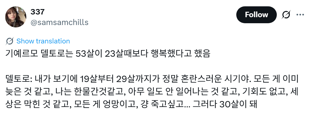 [흥미돋]53살의 자신이 23살때보다 행복하다고 한 기예르모 델토로 감독 작성자귤토끼이|작성시간25.11.21|조회수26,767 목록 댓글 22 글자크기 작게가 글자크기 크게가 출처: https://www.dmitory.com/issue/389425174 https://x.com/samsamchills/status/1991442083283104131?s=46&t=vKTg_J6P_ki70SZniGWYfA 다음검색 현재 게시글 추가 기능 열기 북마크 공유하기 신고 센터로 신고 댓글 댓글 22 댓글쓰기 답글쓰기 댓글 리스트 작성자mogate | 작성시간 25.11.21 20대는 나한테 없는 시기임... 가만히 있어도 정신적으로 힘들었어 작성자김화화 | 작성시간 25.11.21 나도 버티고있는 시간이려나 ㅠ 작성자비비드유니콘 | 작성시간 25.11.21 원래 30정도에 죽었는데 급격하게 수명이 늘어버린 탓일까 작성자바람 | 작성시간 25.11.21 나도 지금이 훨씬 행복해~~ 작성자카드값줘체ㄹl | 작성시간 25.11.21 30-39살도 말해주지 댓글 전체보기