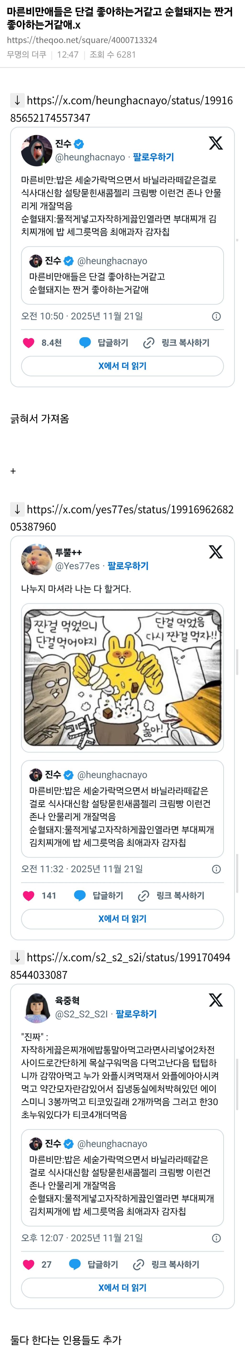 [흥미돋]마른비만애들은 단걸 좋아하는거같고 순혈돼지는 짠거 좋아하는거같애.x 작성자J M W|작성시간25.11.21|조회수40,605 목록 댓글 262 글자크기 작게가 글자크기 크게가 출처: https://theqoo.net/square/4000713324둘 다 좋아한다면...? 다음검색 현재 게시글 추가 기능 열기 북마크 공유하기 신고 센터로 신고 댓글 댓글 262 댓글쓰기 답글쓰기 댓글 리스트 작성자내림올림반올림좌우 | 작성시간 25.11.22 나 마른비만린데 단거극혐 짠거사랑 작성자아버지는섹시드라이버 | 작성시간 25.11.23 ..? 단 거 좋아하는데 그냥 백돼지임 작성자기여벙 | 작성시간 25.11.23 ㄷㄷ 나도 짠 거 좋아함 작성자체리할래 | 작성시간 25.11.23 너 돼지 아니지 둘다임 작성자제로젤리 | 작성시간 25.11.24 둘다 조아욥 댓글 전체보기