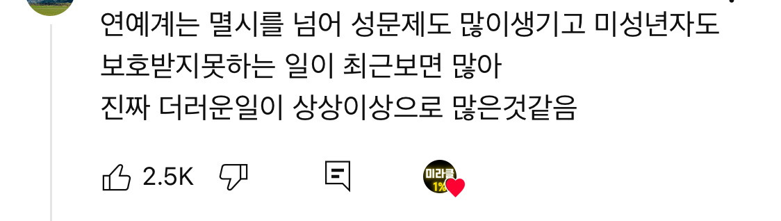 작성자세인트 엑소시스트 작성시간 25.11.21 화류계를 양지화시킨게 연예계같음 그러니 개념이나 도덕성, 지능 같은것을 기대하는것 자체가 무의미