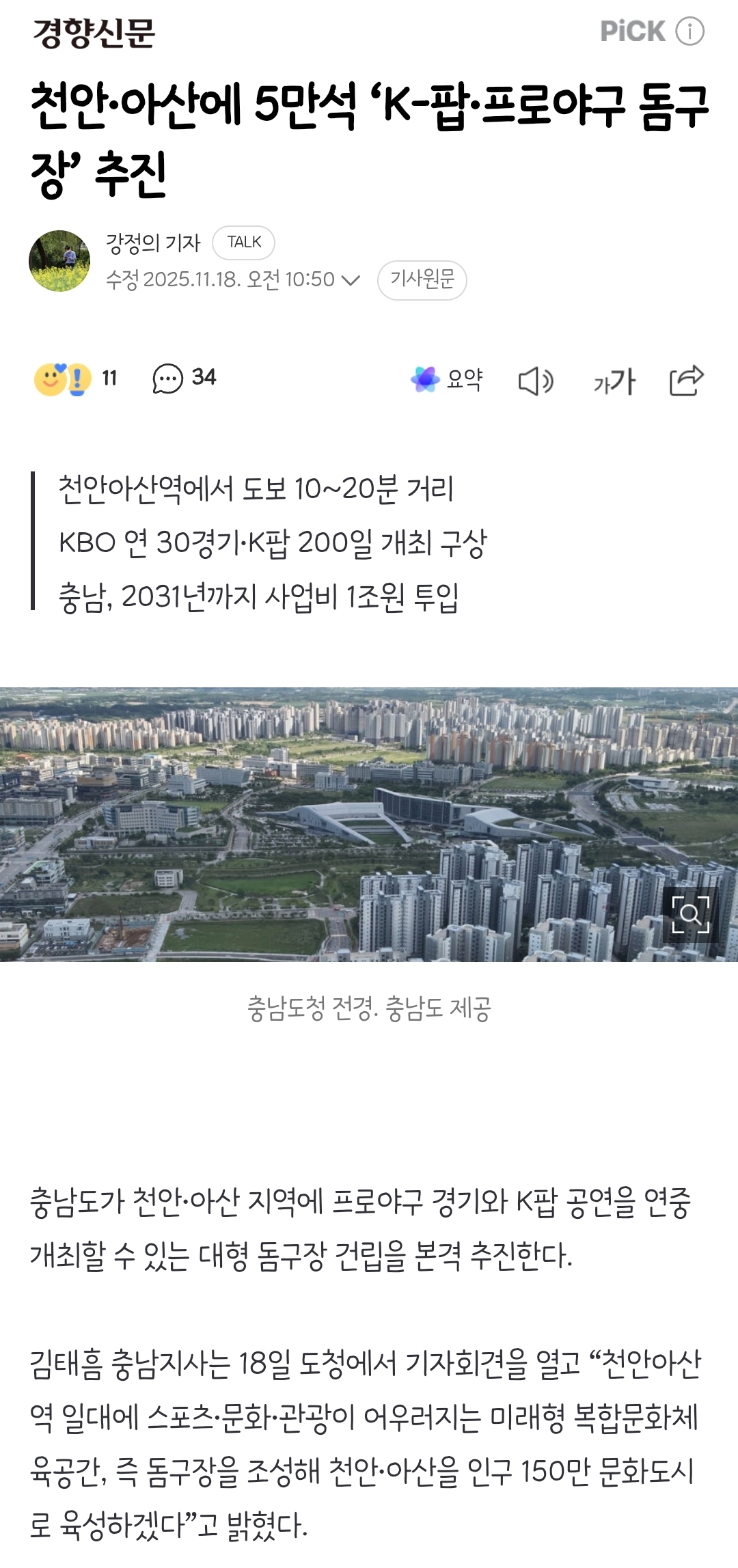 [여시뉴스데스크]천안·아산에 5만석 ‘K-팝·프로야구 돔구장’ 추진 작성자팟즈|작성시간25.11.21|조회수4,534 목록 댓글 20 글자크기 작게가 글자크기 크게가 출처: 여성시대 팟즈https://n.news.naver.com/article/032/0003409428?sid=103천안·아산에 5만석 ‘K-팝·프로야구 돔구장’ 추진충남도가 천안·아산 지역에 프로야구 경기와 K팝 공연을 연중 개최할 수 있는 대형 돔구장 건립을 본격 추진한다. 김태흠 충남지사는 18일 도청에서 기자회견을 열고 “천안아산역 일대에 스포n.news.naver.com 다음검색 현재 게시글 추가 기능 열기 북마크 공유하기 신고 센터로 신고 댓글 댓글 20 댓글쓰기 답글쓰기 댓글 리스트 작성자지재유경 | 작성시간 25.11.21 대박 좋다 작성자아지태 | 작성시간 25.11.21 헐 좋은데 작성자outssz | 작성시간 25.11.21 이거 천안에 780억짜리 야구장인데 1조면 과연?토지매입비만 540억 ㅋㅋㅋㅋ저게 다 완공된거 맞음 지나갈때보면 저상태로 야구하고 있어 얼탱이 이미지 확대 작성자여시대빵 | 작성시간 25.11.21 이리오세요 작성자내꿈은장수왕병 | 작성시간 25.11.23 몇백억 말아먹고ㅋㅋㅋㅋ 댓글 전체보기