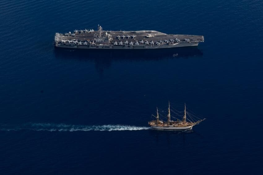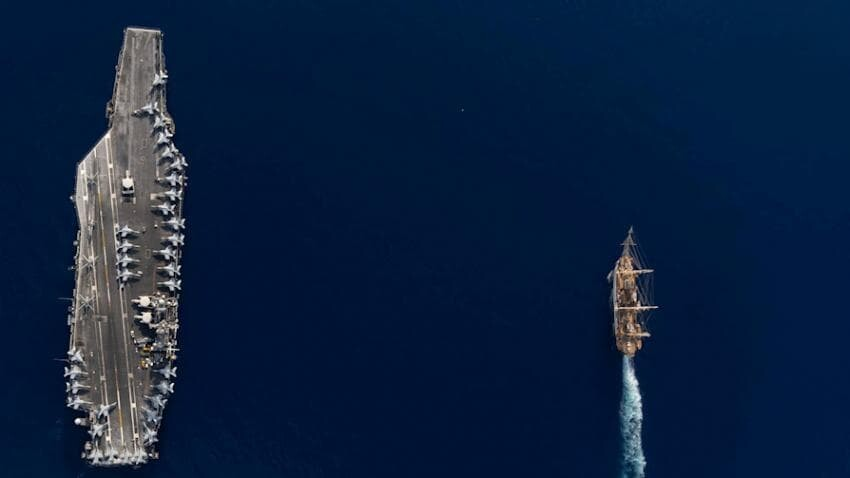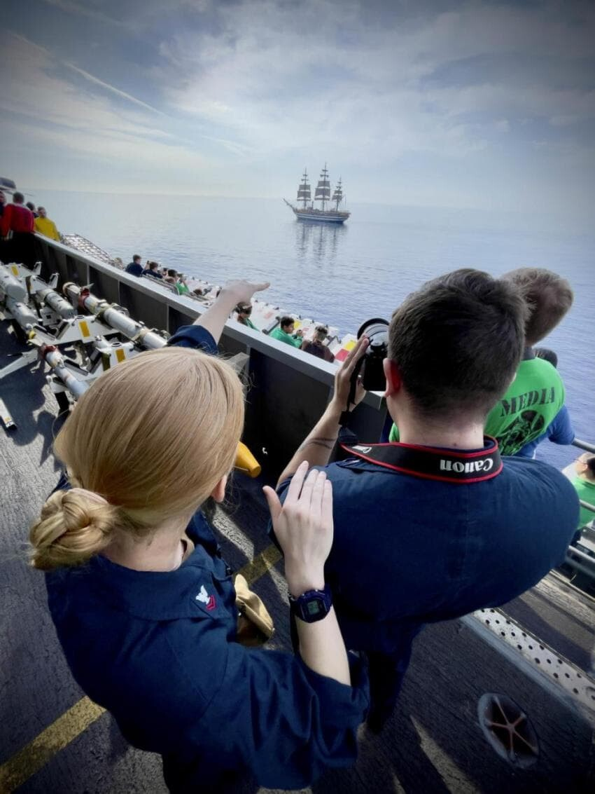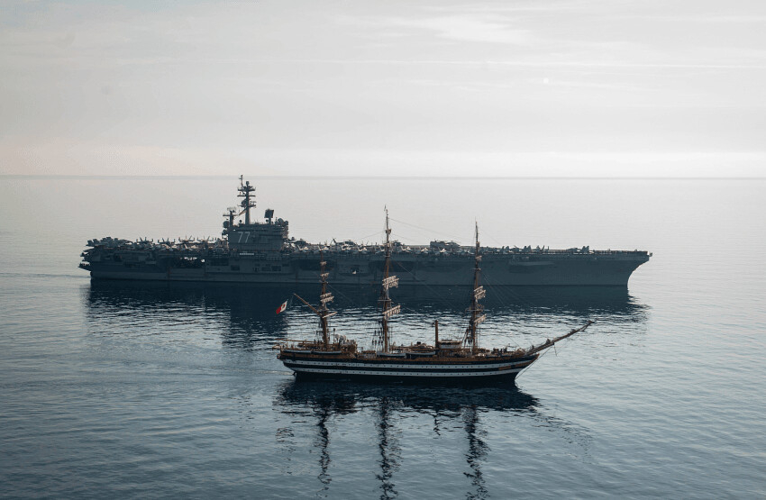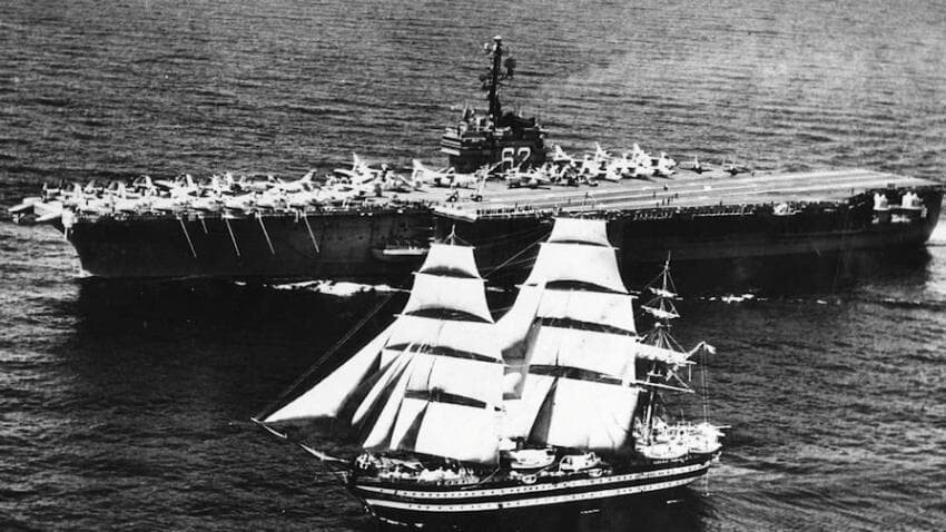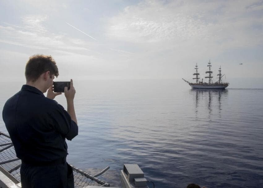 미해군 승조원들은 하늘을 찌를 정도로 높이 솟은 3개의 마스트와 하얀 돛을 펼친 범선의 구경하기 위해 전부 좌현으로 몰려들었다. 배수량은 한참 작았지만 이 시대착오적인 목재범선의 자태는 현대 군사력의 정점인 항공모함의 위용마저 눌러버릴만큼 아름다웠다. 조금 후, 인디펜던스는 엔진을 정지하고 아메리고 베스푸치에게 길을 내어주었다. 국제 선박법에 따르면, 원양정기선(Ocean Liners)에 해당하는 아메리고 베스푸치는 군함보다 통행의 우선권을 가졌기 때문이다.