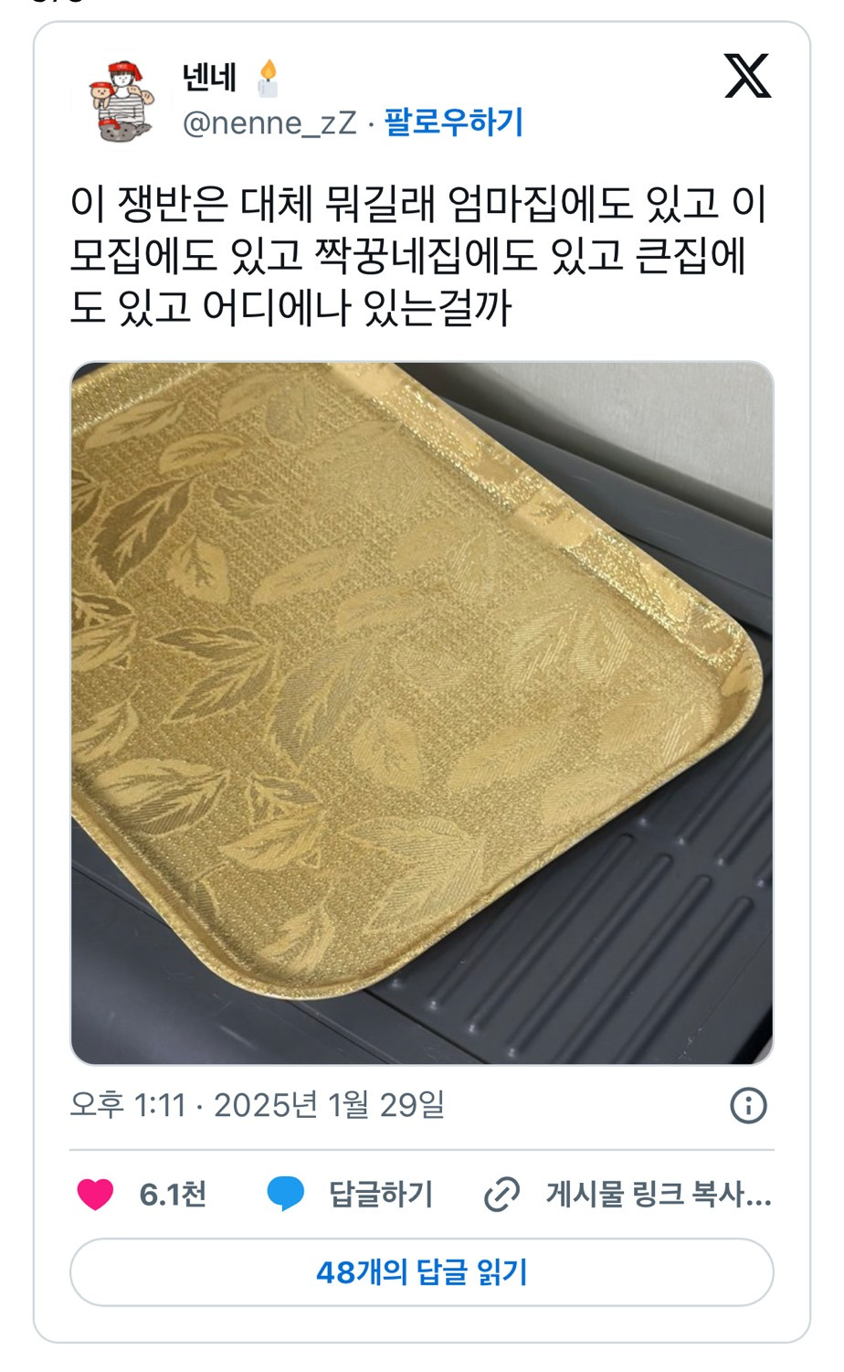 [스크랩] [흥미돋]이 쟁반은 대체 뭐길래 어디에나 있는걸까.twt 작성자냐웅잉|작성시간25.11.21|조회수48,725 목록 댓글 78 글자크기 작게가 글자크기 크게가 출처: 여성시대 냐웅잉우리 회사에도 있음 다음검색 스크랩 원문 : *여성시대* 차분한 20대들의 알흠다운 공간 현재 게시글 추가 기능 열기 북마크 공유하기 신고 센터로 신고 댓글 댓글 78 댓글쓰기 답글쓰기 댓글 리스트 작성자여성애자 | 작성시간 25.11.21 시장에 가면 저거밖에 없던가 저거보다 구린거밖에 없었음.. 작성자맛있는빵 | 작성시간 25.11.21 우리 회사에도 있어ㄷㄷ 작성자슈퍼난투전 | 작성시간 25.11.21 울집에 있어...맨날 저거 나오는데 정체를 아무도 안알랴줌 작성자네 갱은 양갱 | 작성시간 25.11.21 울집에도있어 작성자배려하고살자 | 작성시간 25.11.23 우리집에도 있어.. 댓글 전체보기