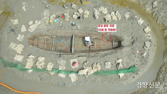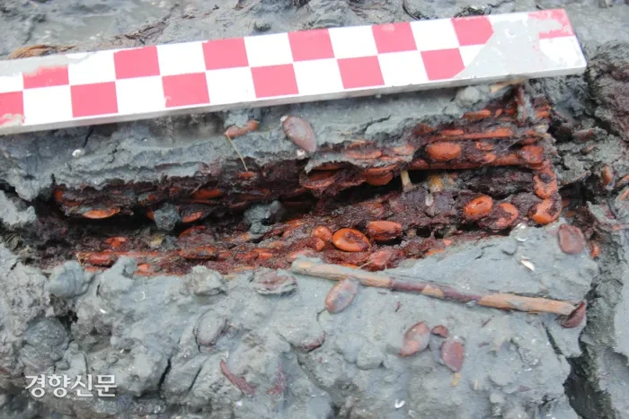 6월26일이었다. 갯벌에 박힌 선체를 인양하려고 배의 바닥판을 들어올릴 때 ‘붉은 색’의 유물이 모습을 드러냈다.