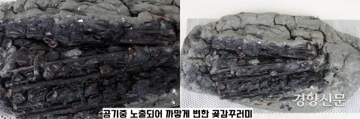 발굴단원이 과육에 코를 갖다댔더니 아! 글쎄, 감의 향이 풍겼다. 곶감 사이에서 몇 개의 나뭇가지를 묶은 흔적이 확인됐다. 곶감을 나뭇가지에 여러개 꽂고 몇 다발 단위로 줄로 묶은 것이 확실했다.