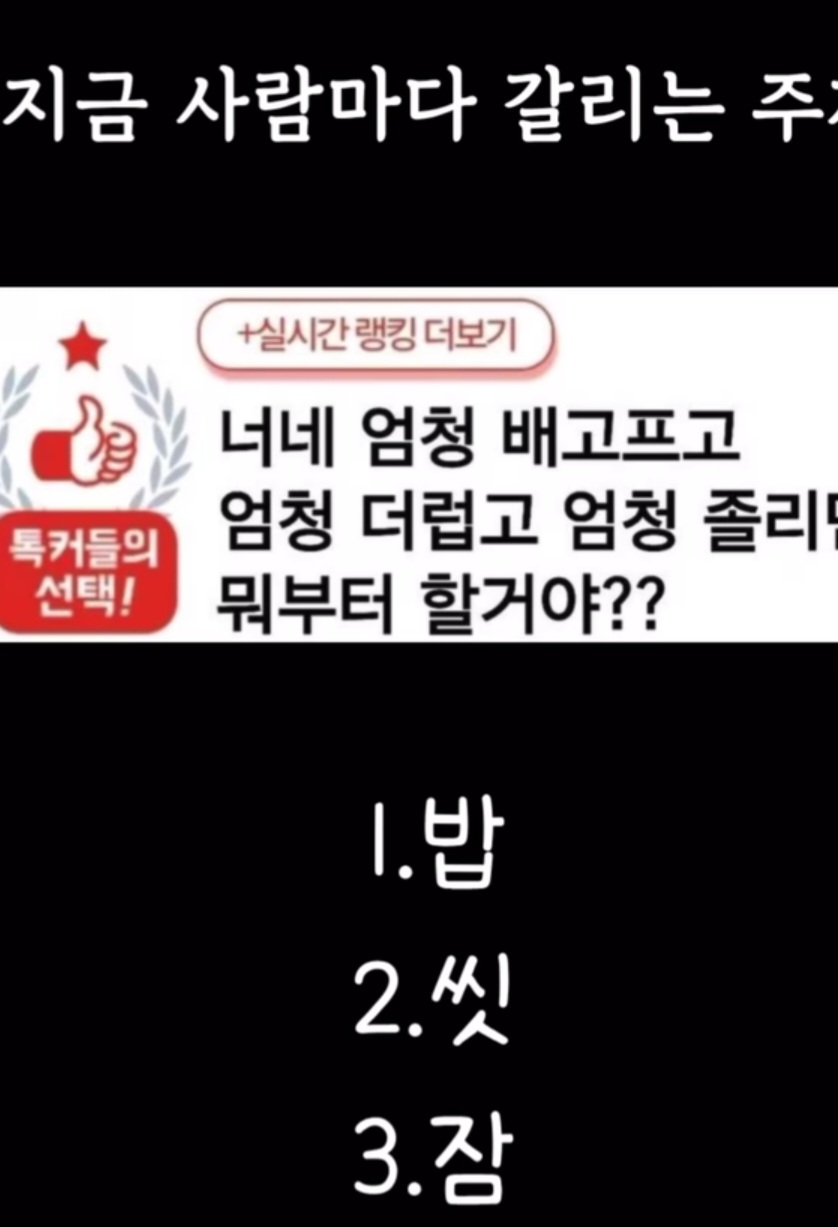 [흥미돋]너네 엄청 배고프고, 엄청 더럽고, 엄청 졸리면 뭐부터 할거야?? 작성자산들바람어|작성시간25.11.22|조회수47,428 목록 댓글 1,076 글자크기 작게가 글자크기 크게가 출처: https://theqoo.net/square/40012290991. 배고프니 밥부터2. 더러우니 먼저 씻기3. 잠오니 일단 잠난 밥씻잠 다음검색 현재 게시글 추가 기능 열기 북마크 공유하기 신고 센터로 신고 댓글 댓글 1,076 댓글쓰기 답글쓰기 댓글 리스트 작성자대한독립조세 | 작성시간 25.11.24 씻고 자고 먹기 작성자코불소 | 작성시간 25.11.24 씻잠밥 작성자참아야지뭐 | 작성시간 25.11.24 일단 잠 인나서 밥먹고 그 기운으로 씻음 작성자박보영손예진한지민 | 작성시간 25.11.24 씻기-잠 작성자2번째백수 | 작성시간 25.11.29 씻잠밥안씻고 침대위❌❌❌❌ 댓글 전체보기