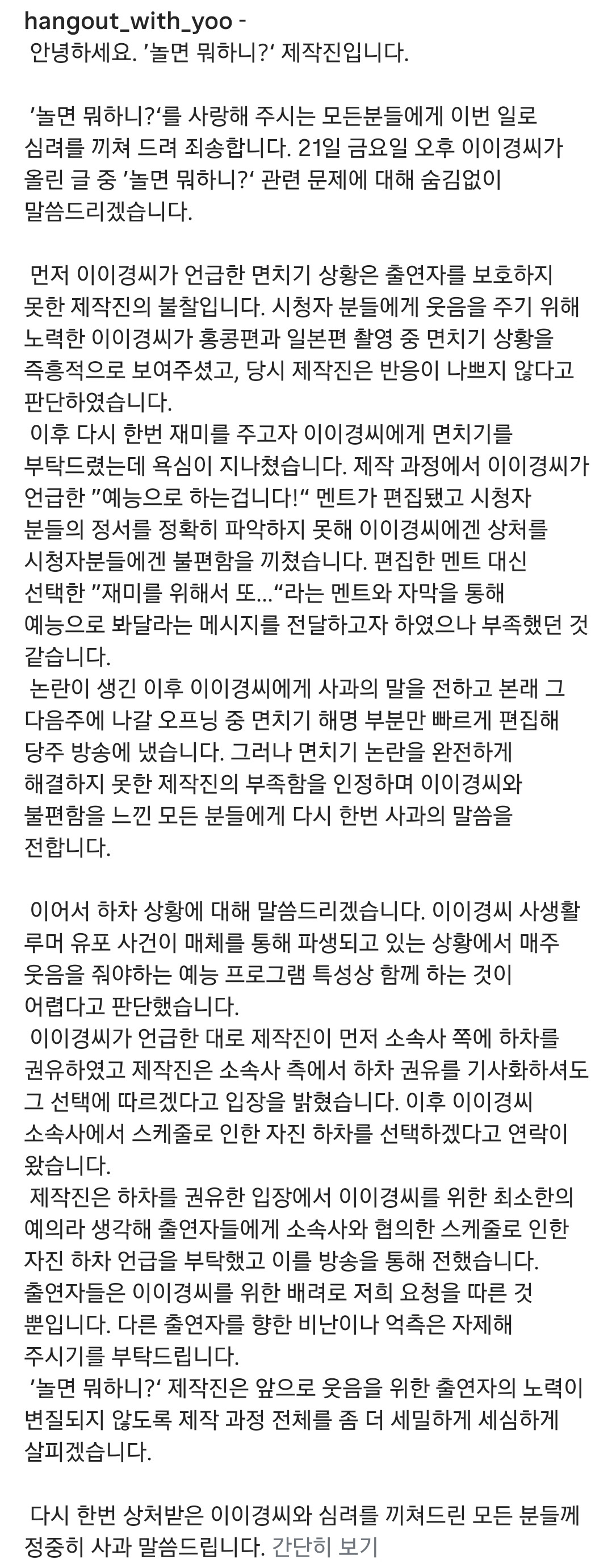 [흥미돋]<놀면뭐하니?> 이이경 (면치기, 하차) 관련 공식 입장 전문 작성자Sunmoonstar02|작성시간25.11.22|조회수92,925 목록 댓글 380 글자크기 작게가 글자크기 크게가 출처: https://www.dmitory.com/issue/389569844 다음검색 현재 게시글 추가 기능 열기 북마크 공유하기 신고 센터로 신고 댓글 댓글 380 댓글쓰기 답글쓰기 댓글 리스트 작성자역카프리오 | 작성시간 25.11.24 면치기는 웃겼는데 맥락을 목접네 작성자올리브싫어 | 작성시간 25.11.26 이거 댓글 존나 노답임 ;;; 작성자박보람 | 작성시간 25.11.29 면치기는 그냥 예능에서 노력한거라 보였는데 악플많았나보네ㅠ 제작진 이해됨.. 작성자Mznw | 작성시간 25.12.06 제작진 고생햇다.. 작성자검언해체내란사형 | 작성시간 25.12.07 new 제작진 고생이 많다 댓글 전체보기