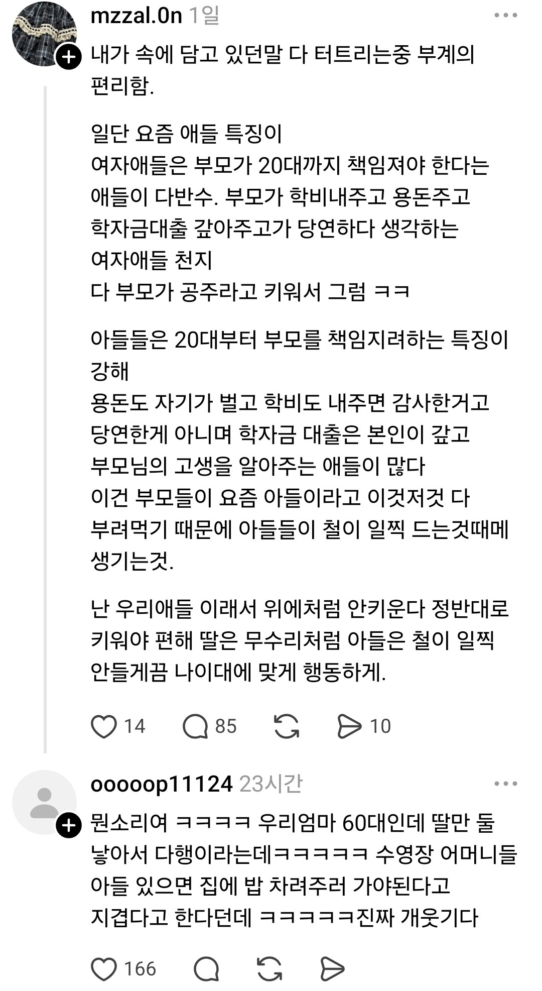 [흥미돋]요새 딸들은 공주 처럼 키우고 아들은 부모 책임지려고 하는 특징이 강해 작성자Sunmoonstar02|작성시간25.11.22|조회수33,802 목록 댓글 251 글자크기 작게가 글자크기 크게가 출처: https://x.com/todaythred/status/1991816162662068705?s=20 다음검색 현재 게시글 추가 기능 열기 북마크 공유하기 신고 센터로 신고 댓글 댓글 251 댓글쓰기 답글쓰기 댓글 리스트 작성자깨끗깨끗 락스청소 | 작성시간 25.11.23 엥 작성자김연경감독쵝오 | 작성시간 25.11.23 개소리야 ㅋㅋㅋ 작성자바쁜강쥐 | 작성시간 25.11.23 아들맘이 또 작성자무소니코픔라딘고 | 작성시간 25.11.23 딸 공주처럼 키워도 폭력성 걱정안된다아들 공주처럼 키우면 폭력성 각오해야한다 작성자내 꿈은 돈 많은 백수 | 작성시간 25.11.24 ㅌㅋㅋㅋ 댓글 전체보기
