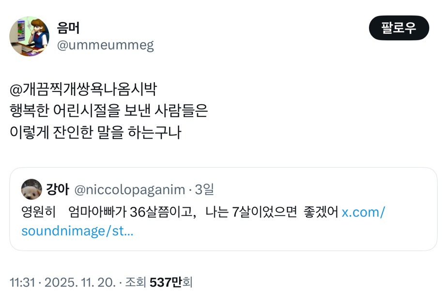 [흥미돋]콩스프 이론과 궤를 같이하는 불행배틀 작성자느개비롯데리아에서계엄모의함|작성시간25.11.22|조회수3,331 목록 댓글 12 글자크기 작게가 글자크기 크게가 출처: 여성시대 느개비롯데리아에서계엄모의함평범한 원트뜬금없이 불행한 어린시절 늘어놓으며 원트윗주에게 쌍욕보일수있는 인용알티하기... 요즘 sns에 이런 사람 많아진것같음 콩스프 이론보고 비슷한 내용같아서 가져와봄남들 행복이나 추억도 못견디는걸까... 다음검색 현재 게시글 추가 기능 열기 북마크 공유하기 신고 센터로 신고 댓글 댓글 12 댓글쓰기 답글쓰기 댓글 리스트 작성자피르교 | 작성시간 25.11.22 왜저래 정신병은 혼자풀지 작성자특별한기적을기다리지마 | 작성시간 25.11.22 정말 트위터답다 작성자아이캔두잇. | 작성시간 25.11.22 헐ㄹㅇ 내 주위엔 실제 말로 하는 동생도 잇엇음ㅋㅋㅋㅋ 진짜 무슨 말을 못해... 작성자붓기빼는레몬젤리 | 작성시간 25.11.22 뭔 ㅅㅂ.. 작성자착한 와와 | 작성시간 25.11.23 님 말고 원트님이 그럿다고요 댓글 전체보기