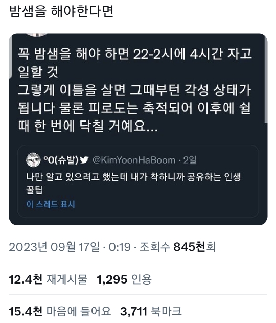 작성자한국풍 작성시간 25.11.23 나는 근데 원래 자정 전에 잠들면 새벽 1-2시에 100프로 확률로 깨 그리고 해가 떠야 잠들 수 있어