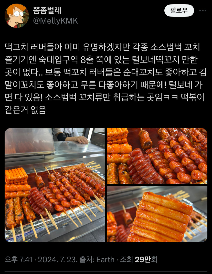 [스크랩] [흥미돋]숙대입구역 8출 털보네 떡꼬치 작성자시간에기대어|작성시간25.11.22|조회수63,969 목록 댓글 63 글자크기 작게가 글자크기 크게가 출처: 여성시대 떡대수https://x.com/mellykmk/status/1815698681796214794?s=46X의 쫌좀벌레님(@MellyKMK)떡고치 러버들아 이미 유명하겠지만 각종 소스범벅 꼬치 즐기기엔 숙대입구역 8출 쪽에 있는 털보네떡꼬치 만한 곳이 없다.. 보통 떡꼬치 러버들은 순대꼬치도 좋아하고 김말이꼬치도 좋아하고x.com아 떡꼬치 존맛일듯 하… 다음검색 스크랩 원문 : *여성시대* 차분한 20대들의 알흠다운 공간 현재 게시글 추가 기능 열기 북마크 공유하기 신고 센터로 신고 댓글 댓글 63 댓글쓰기 답글쓰기 댓글 리스트 작성자감자쫀드기 | 작성시간 25.11.23 와 미틴 작성자로투스도넛 | 작성시간 25.11.23 아 대박 작성자Samock | 작성시간 25.11.23 미쳤다…ㅠ 작성자뭐래는겨 | 작성시간 25.11.24 올마에 형성되어있나요 작성자메로메롱바 | 작성시간 25.11.30 다음주에 가야겠드 댓글 전체보기