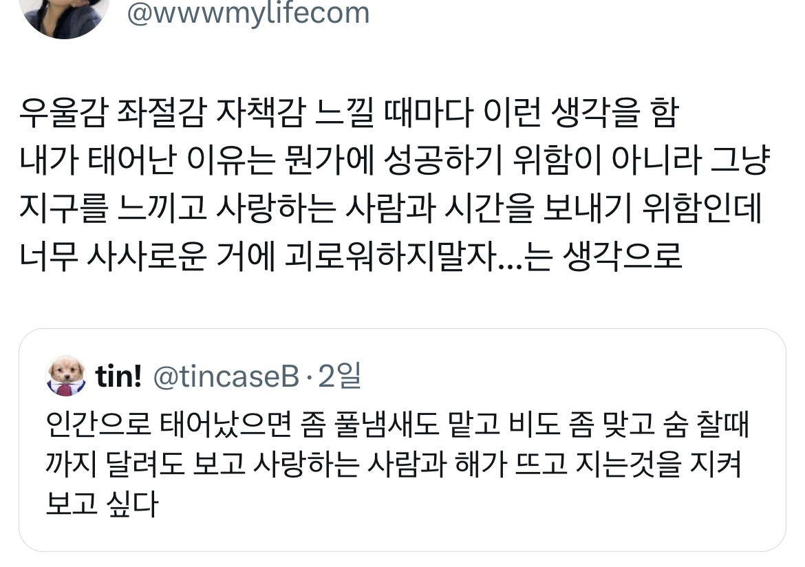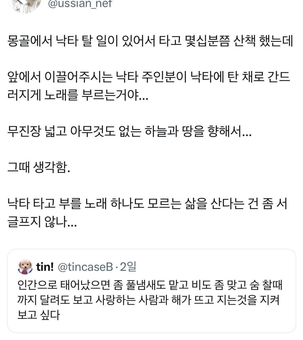 작성자털뿡이들 작성시간 25.11.23 너무 멋진 말과 사진들이다... 진짜 인생은 무위자연으로 돌아가 그냥 사계절 느끼고 바람에 행복해하고 그럼 되는거 같아... 덧없는 집착보단 온전히 주위에 주위하는 걸 느낄 때 비로소 행복해지는 거 같음....