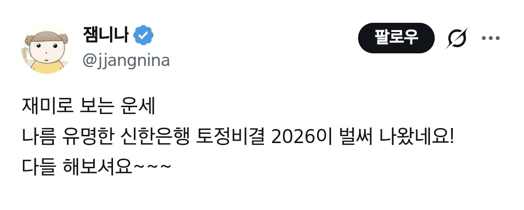 [흥미돋]벌써나온 신한은행 2026년 토정비결 작성자털갈이시즌|작성시간25.11.23|조회수53,243 목록 댓글 747 글자크기 작게가 글자크기 크게가 출처: https://theqoo.net/square/4002592404:: 신한라이프 ::여기를 눌러 링크를 확인하세요shinhanlife.sinbiun.com가볍게!!! 재미로 보기 다음검색 현재 게시글 추가 기능 열기 북마크 공유하기 신고 센터로 신고 댓글 댓글 747 댓글쓰기 답글쓰기 댓글 리스트 작성자모은 | 작성시간 25.12.01 복채💜🩵 작성자바람솔솔부는날 | 작성시간 25.12.05 고마워🍀 작성자행운행복클로버 | 작성시간 25.12.06 다시 보니 저번에 봤을 때랑 운세가 바뀌었네! 작성자귤이랑오렌지랑 | 작성시간 25.12.06 복채 작성자Kia기아 | 작성시간 25.12.06 복채🩵 댓글 전체보기