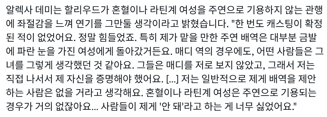 자의로 조용히 지낸 게 아니라 인종적인 한계로 인해 원하는 역할과 기회를 못 얻어서 그런 거였나 봄...