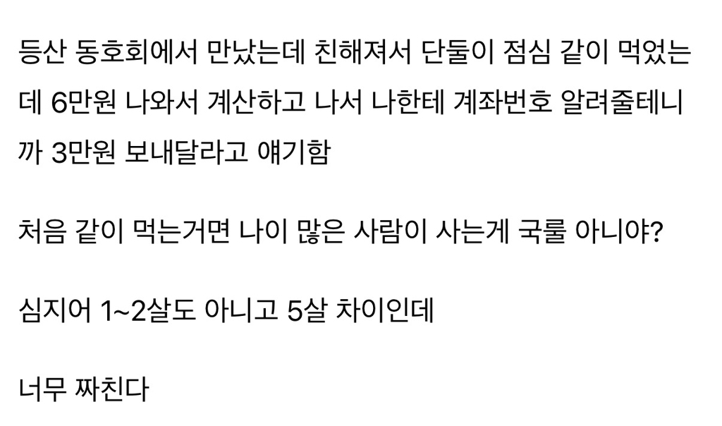 [흥미돋]나보다 5살 많은 언니랑 점심 먹었는데 더치페이하고 옴 ㅋㅋㅋ 작성자머리부터발끝까지한있슈|작성시간25.11.23|조회수65,192 목록 댓글 323 글자크기 작게가 글자크기 크게가 출처: https://www.instiz.net/name/64994810친언니도 뿜빠이다 뭔 다음검색 현재 게시글 추가 기능 열기 북마크 공유하기 신고 센터로 신고 댓글 댓글 323 댓글쓰기 답글쓰기 댓글 리스트 작성자자산10억된다 | 작성시간 25.11.25 뭐야세발 작성자나는 소중해 | 작성시간 25.11.25 맡겨놧냐 진짜 ㅋㅋㅋ 작성자뀨르릉릉 | 작성시간 25.11.26 극혐 작성자개같으시다 | 작성시간 25.11.26 사줄줄알고 비싼거먹었나보네 ㅋㅋㅋㅋ 작성자둥가둥스 | 작성시간 25.12.01 나같으면 사주겠다... 댓글 전체보기