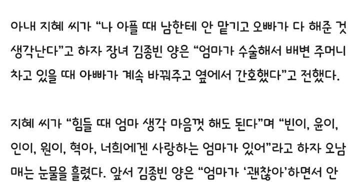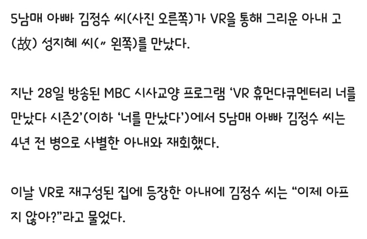 작성자쟤니제니쟨 작성시간 25.11.23 첫째 딸이 인터뷰에서 엄마돌아가시고 씩씩하게 극복해서 잘 살아보려는데 아빠가 이거 하자그래서 처음에 화났다고..근데 저 아빠가 이렇게라도 아내를 만나고싶어서 딸한테 폰 바꿔주겠다 막 이런거 걸고그랬대 ㅠㅠ