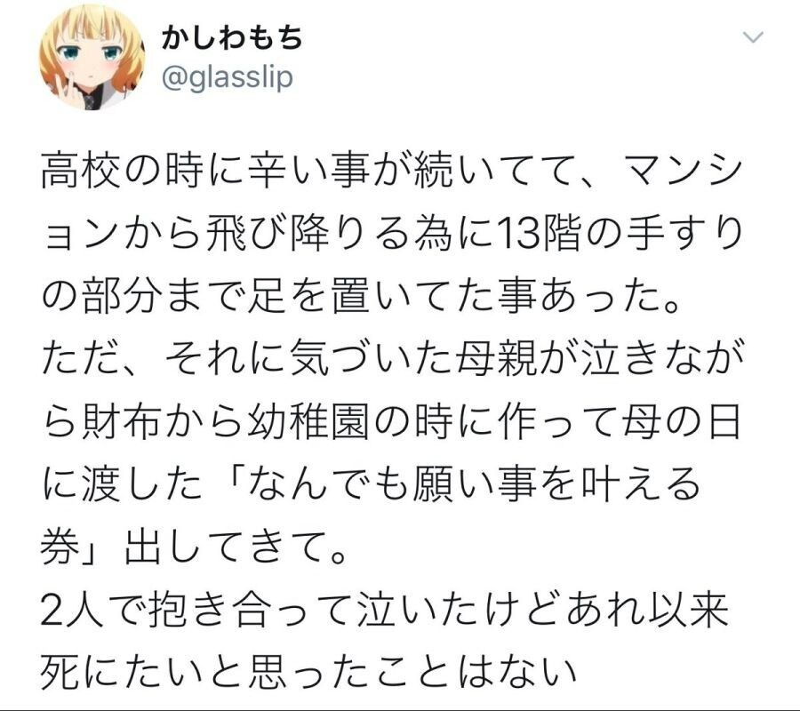 고등학교 때 힘든일이 계속되어서 아파트에서 뛰어내리기 위해 13층 난간부분까지 올라탄 적이 있었다.
