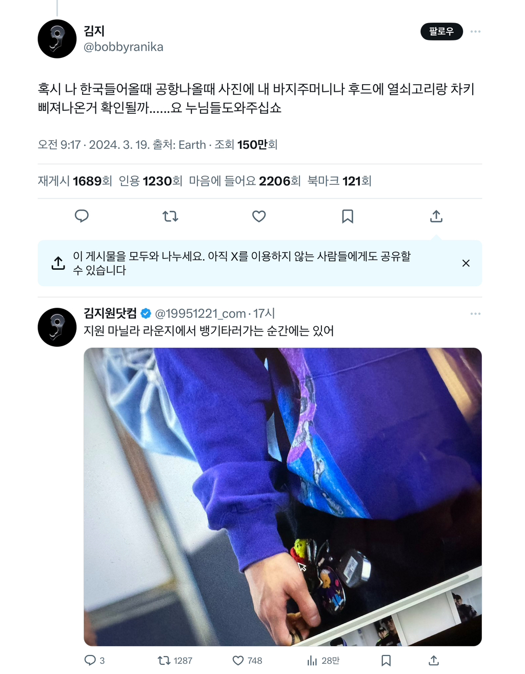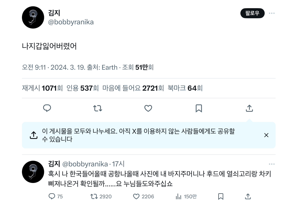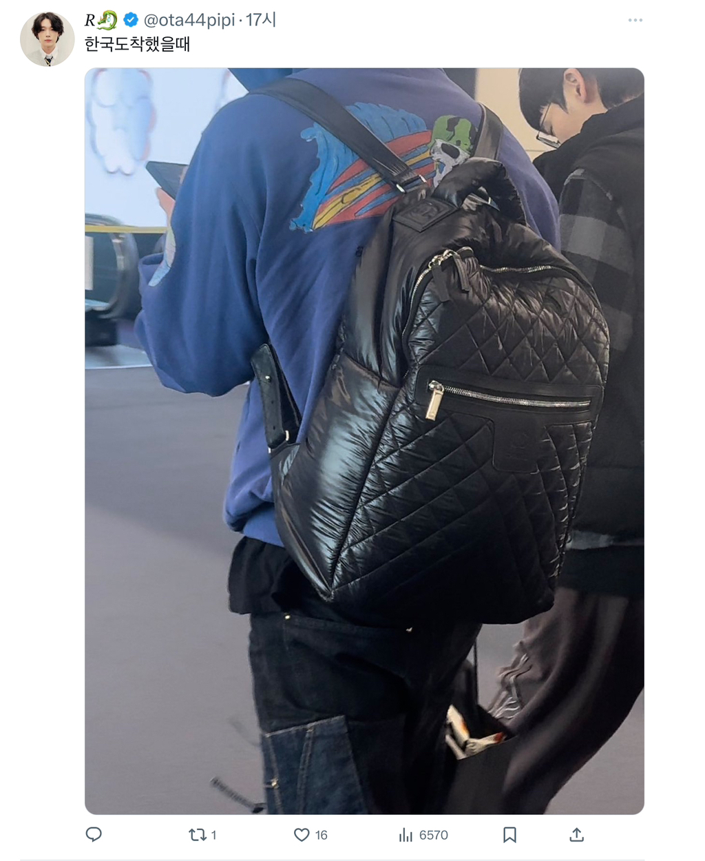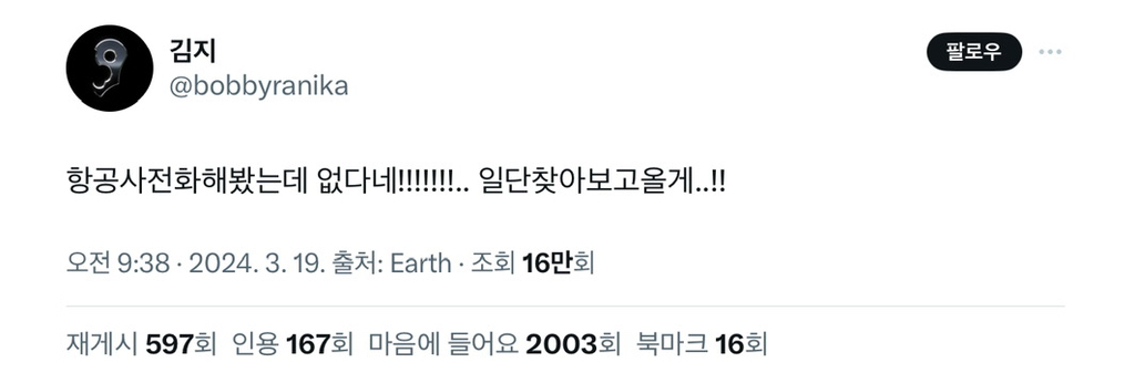 한국공항 입국 사진엔 키링 주렁주렁 안 보임