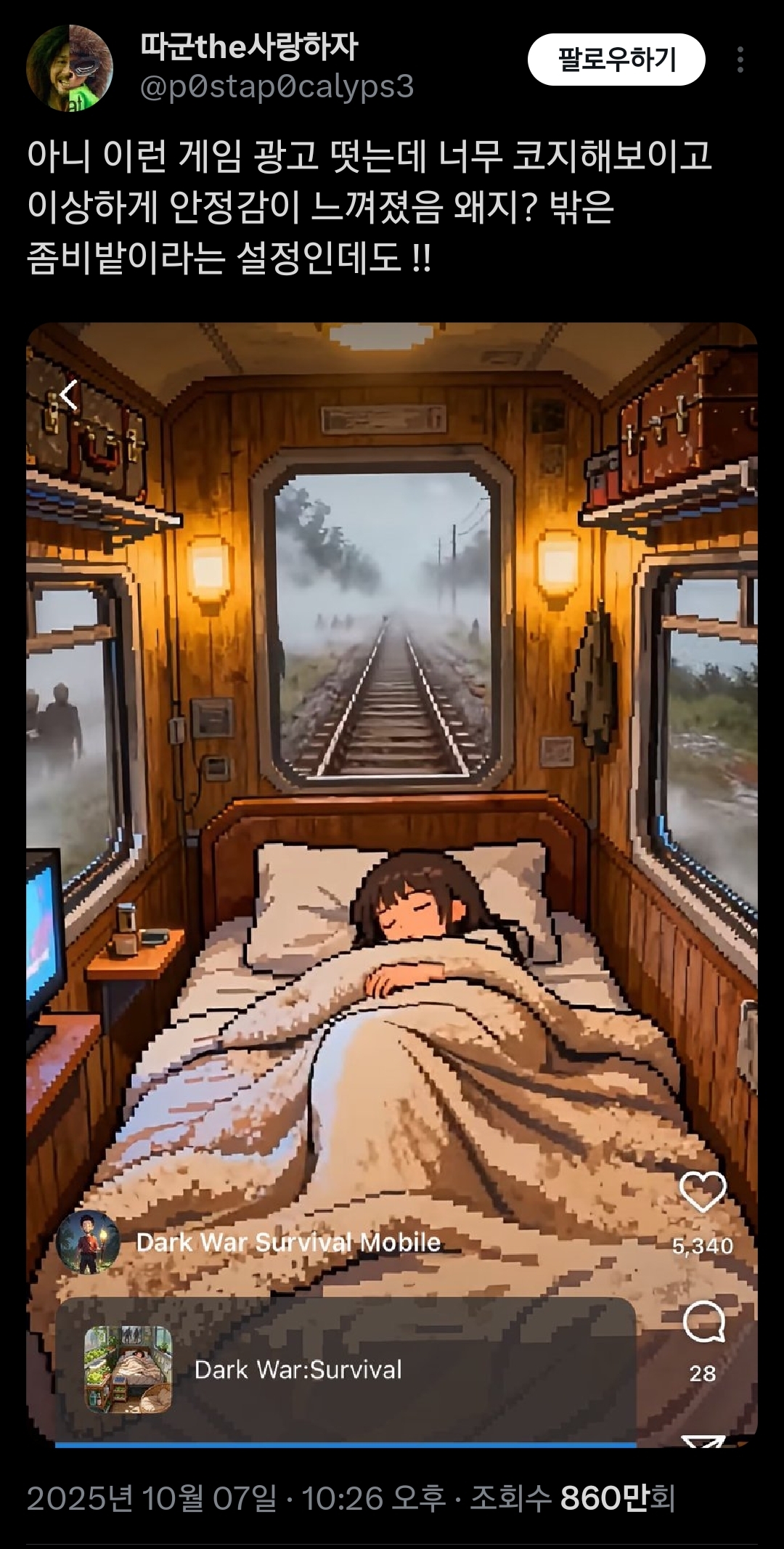 작성자갱송링 작성시간 25.11.24 나이런거 좋아해서 이런거만 팔로우한 계정 따로 만들었는데, 밖에서 어슬렁 거리는 좀비가 창문으로 슬금슬금 들어오는게 있어서 공포물됨 ;;; 양산형이라 마구잡이로 만들어서 실수한듯 ㅠㅠ ㅋㅋㅋ