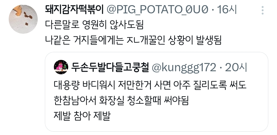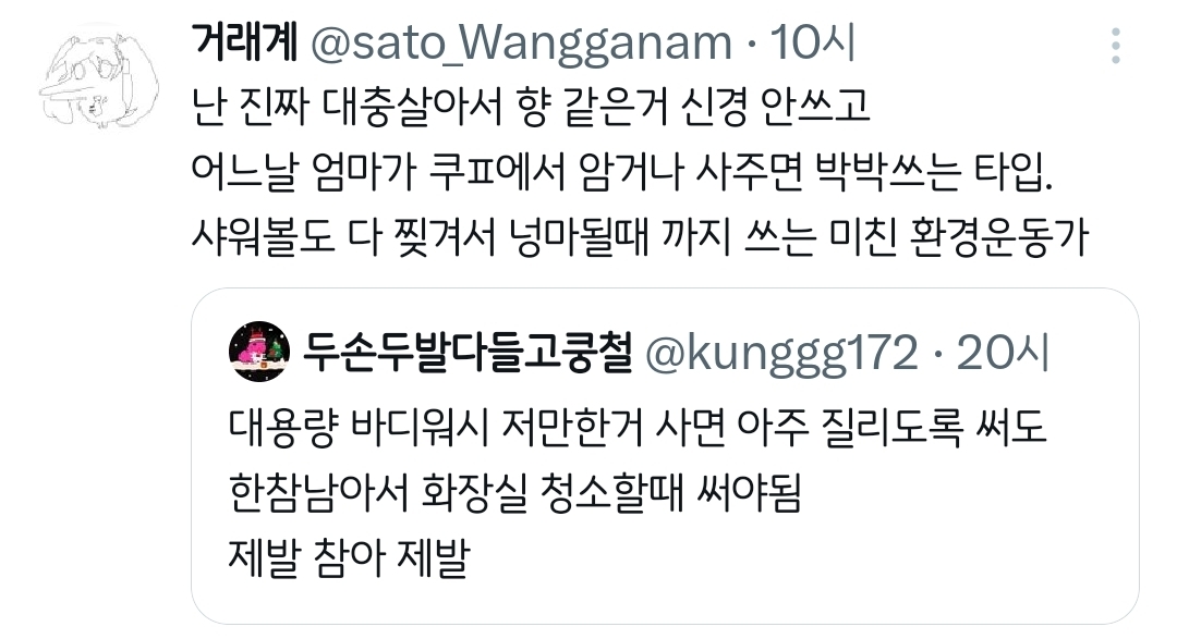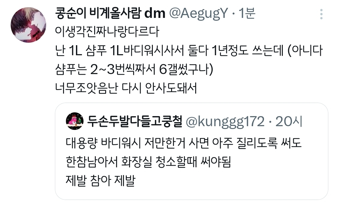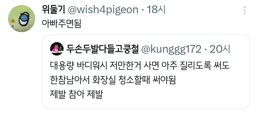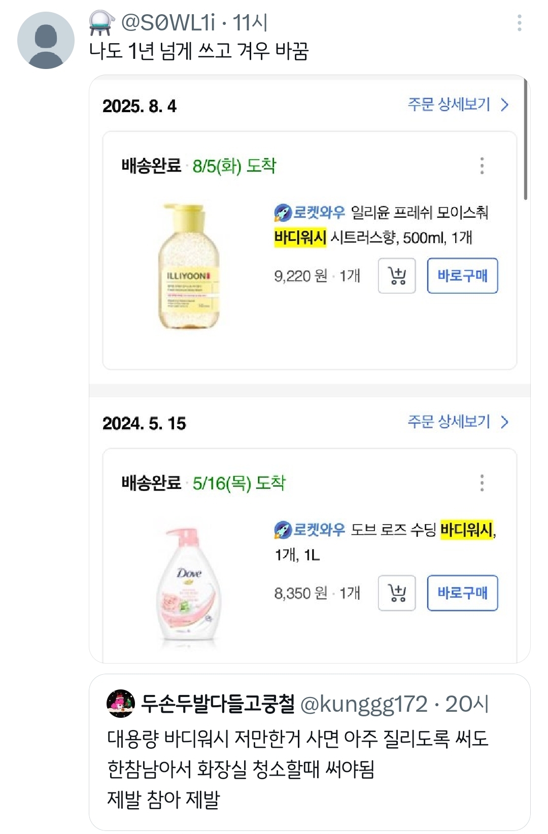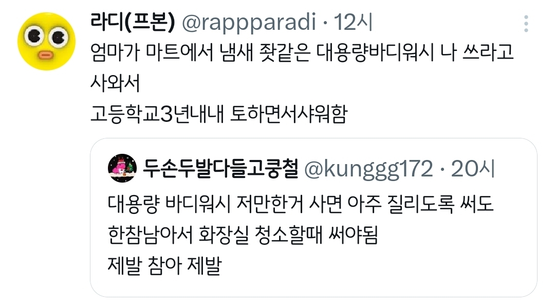 작성자느ㅣ개비최종학력리박스쿨 작성시간 25.11.24 당근에서 바디워시 교환 했으면 좋겠다..... 1/3씩 쓰고 서로교환.....