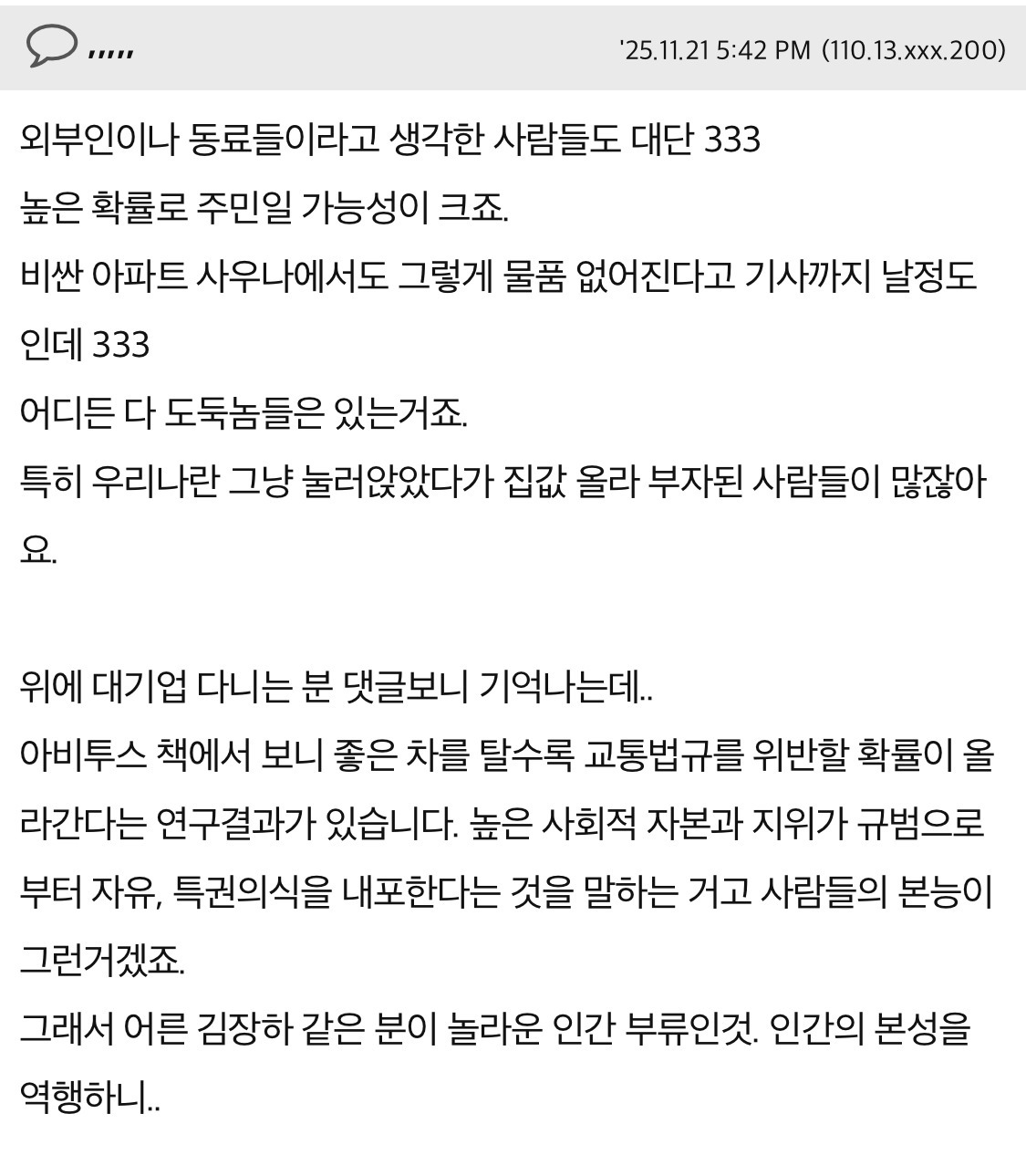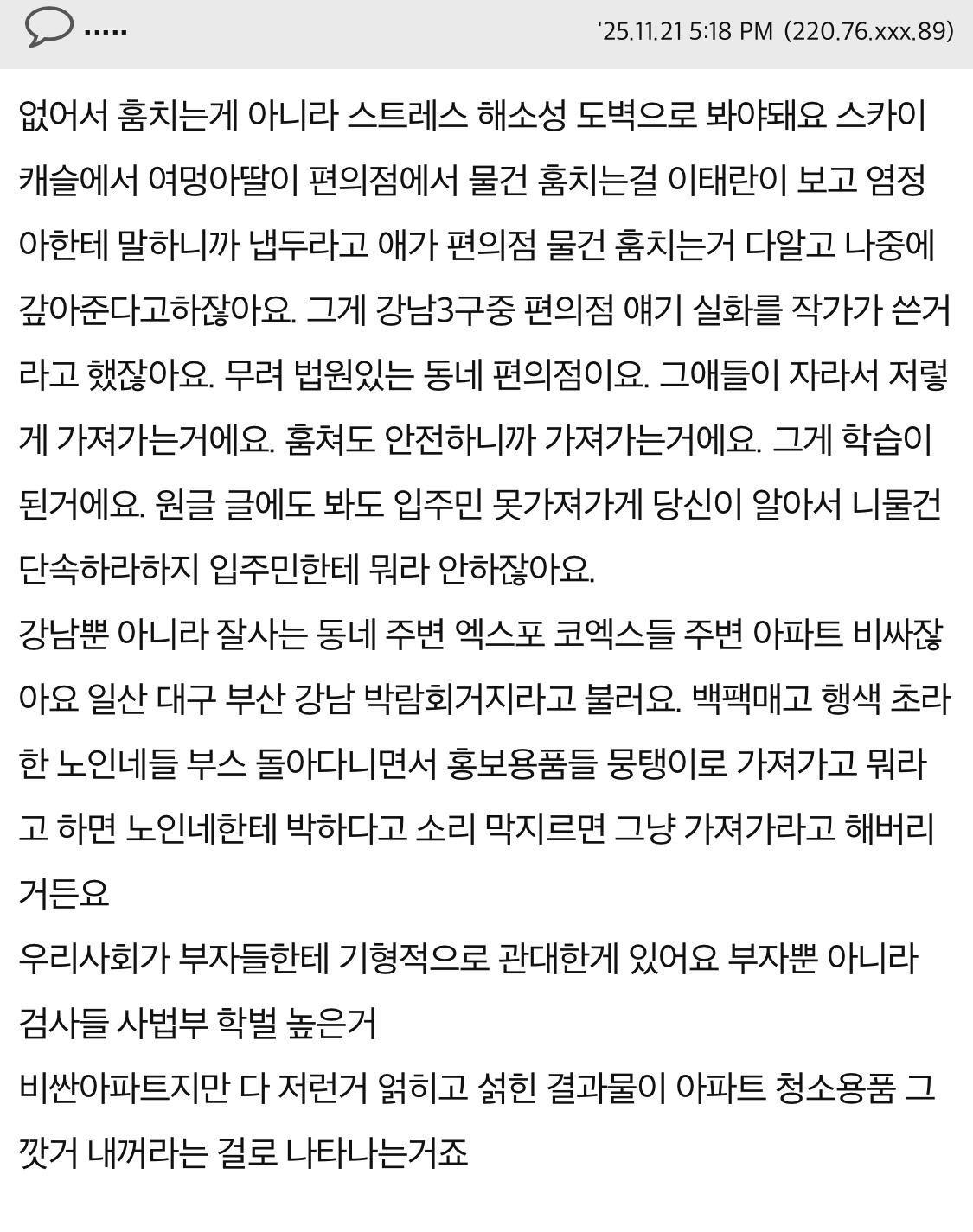 작성자공정하다는착각 작성시간 25.11.24 우스갯소리로 동료들이랑 아 저렇게 살아야 부자되는구나 함 매순간