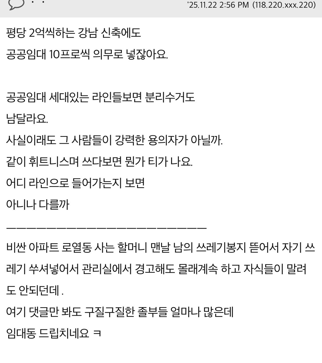작성자더울땐 귀여운게 최고 작성시간 25.11.24 비싼 아파트 사는 놈들이 더 추해... 이미 가진게 많은데 더 가지려고 그악스럽게 사는 추한 인간 너무 많고 그 대표격이 김건희