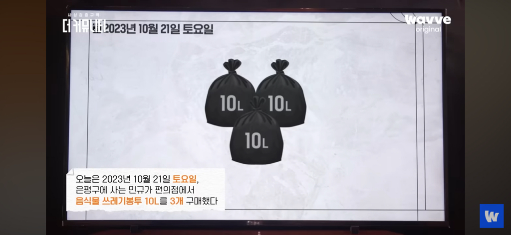 오늘은 2023년 10월 21일 토요일, 은평구에 사는 민규가 편의점에서 음식물 쓰레기봉투 10L를 3개 구매했다