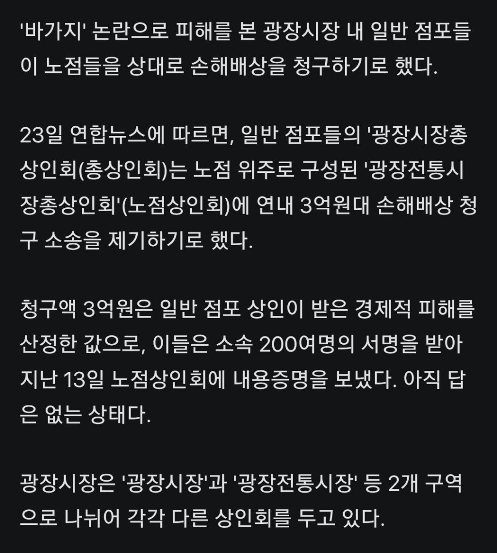 [스크랩] [여시뉴스데스크]"노점탓에 피해 막심"…'바가지 논란' 광장시장 3억 소송, 무슨일 작성자flflf|작성시간25.11.24|조회수10,533 목록 댓글 9 글자크기 작게가 글자크기 크게가 출처 : https://v.daum.net/v/20251123183350489"노점탓에 피해 막심"…'바가지 논란' 광장시장 3억 소송, 무슨일'바가지' 논란으로 피해를 본 광장시장 내 일반 점포들이 노점들을 상대로 손해배상을 청구하기로 했다. 23일 연합뉴스에 따르면, 일반 점포들의 '광장시장총상인회(총상인회)는 노점 위주로 구v.daum.net 다음검색 스크랩 원문 : 소주담(談) : 소소한 주민들의 이야기 현재 게시글 추가 기능 열기 북마크 공유하기 신고 센터로 신고 댓글 댓글 9 댓글쓰기 답글쓰기 댓글 리스트 작성자하쮸핑 | 작성시간 25.11.24 굿 작성자또 이러신다 | 작성시간 25.11.24 굿 ㅋㅋㅋㅋ 3억물어내고 정상되세용 작성자올조이 | 작성시간 25.11.24 3억 물어내지 못하면 자리 빼던가... 작성자오늘은 기분이 좋아 | 작성시간 25.11.24 일반 점포들이 싸고 친절하던데 오래 참았네 작성자도없살 | 작성시간 25.11.24 나이스~~~ 댓글 전체보기