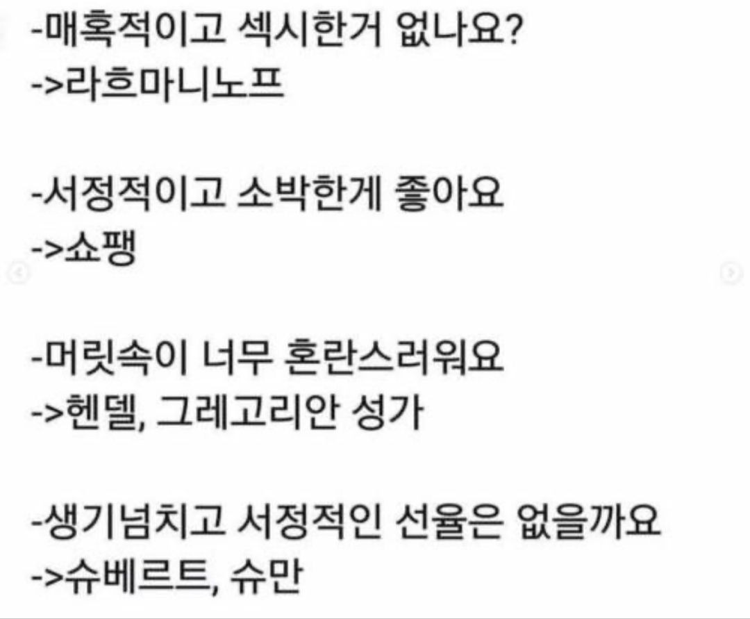 [흥미돋]클래식 개쉽게 접근하는 법 작성자빛을닮아갈때|작성시간25.11.24|조회수16,742 목록 댓글 18 글자크기 작게가 글자크기 크게가 출처: 여성시대 빛을닮아갈때 다음검색 현재 게시글 추가 기능 열기 북마크 공유하기 신고 센터로 신고 댓글 댓글 18 댓글쓰기 답글쓰기 댓글 리스트 작성자뭐뭐뭐뭐라고 | 작성시간 25.11.24 와 라흐마니노프 인정 듣자마자 겁나 화려하고 섹시함 작성자개츄베릅싹싹갈비버억 | 작성시간 25.11.24 라흐마니노프 좋아 작성자못가 | 작성시간 25.11.24 오직 라흐마니노프...라흐흑라흐흑 작성자Rubyjane | 작성시간 25.11.24 쇼팽 넘좋 작성자곰브리치야 내 이름 적어둬라 | 작성시간 25.11.24 베토벤이 좋더라니… 댓글 전체보기