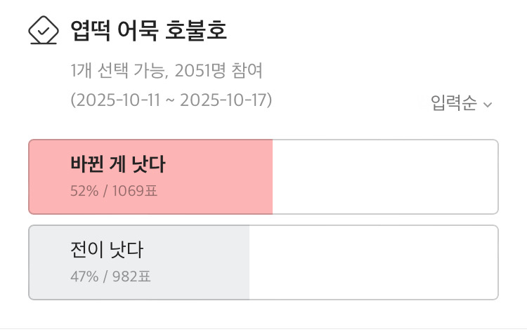[흥미돋]엽떡 어묵 바뀐 게 낫다 vs 전이 낫다 작성자Rich|작성시간25.11.24|조회수17,862 목록 댓글 104 글자크기 작게가 글자크기 크게가 출처: 여성시대 Rich저번엔 결과 이렇게 떴었음 다음검색 현재 게시글 추가 기능 열기 북마크 공유하기 신고 센터로 신고 댓글 댓글 104 댓글쓰기 답글쓰기 댓글 리스트 작성자야구좋아하지마라 | 작성시간 25.11.25 헐 엽기오뎅파인 난 바뀐게 훨 나은데 비린맛안나서.. 작성자엽뗙사랑 | 작성시간 25.11.25 오래 먹던 사람이라면 전이지..어묵을 떠나서 맛이 변함 작성자all the people | 작성시간 25.11.25 난 바뀐게 더 좋음 작성자월화수토일일일 | 작성시간 25.11.25 전 작성자코끼리땃지 | 작성시간 25.11.25 난 차이를 모르겠어 ... 댓글 전체보기