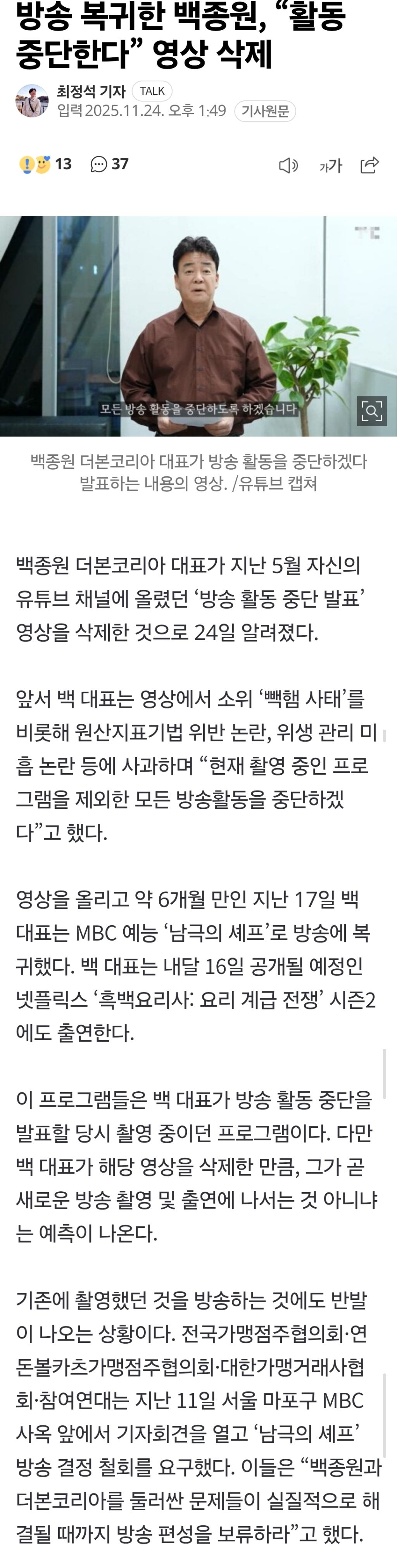 [스크랩] [기타]방송 복귀한 백종원, “활동 중단한다” 영상 삭제 작성자외숙모|작성시간25.11.24|조회수15,321 목록 댓글 35 글자크기 작게가 글자크기 크게가 다음검색 스크랩 원문 : 이종격투기 현재 게시글 추가 기능 열기 북마크 공유하기 신고 센터로 신고 댓글 댓글 35 댓글쓰기 답글쓰기 댓글 리스트 작성자컨텍스트 | 작성시간 25.11.24 왜 돌아와??? 작성자눈물나는날에는 | 작성시간 25.11.24 온갖 불법을 저질렀는데....티비에 나올수 있는거냐고; 작성자Valancy Stirling | 작성시간 25.11.24 자숙 오래하고나오는게 그으나마 낫지않음 본인한테도? 흑백2도 보기싫음 작성자운동화찾아주는여시 | 작성시간 25.11.24 ㅋㅋㅋ누가봐줌 작성자지아양양이 | 작성시간 25.11.25 이럴줄알았다 댓글 전체보기