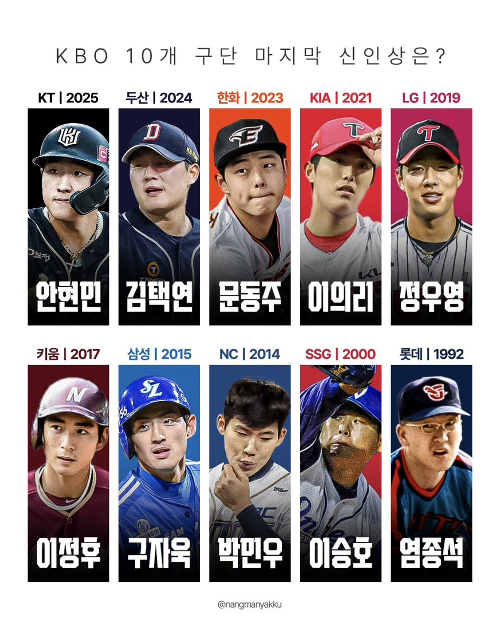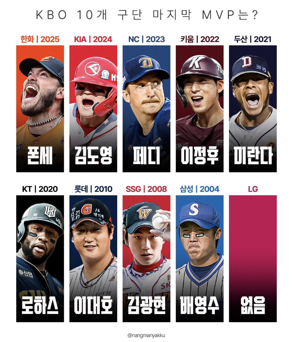 [흥미돋][KBO] 새로 업데이트된 구단별 마지막 신인상 / MVP 작성자죄송합니다겠냐고|작성시간25.11.24|조회수7,361 목록 댓글 45 글자크기 작게가 글자크기 크게가 출처: 여성시대 죄송합니다겠냐고안현민선수 신인왕 ㅊㅋ합니다폰세선수 MVP ㅊㅋ합니다 다음검색 현재 게시글 추가 기능 열기 북마크 공유하기 신고 센터로 신고 댓글 댓글 45 댓글쓰기 답글쓰기 댓글 리스트 작성자우리이정도면많이온거에요 | 작성시간 25.11.24 로하스야……늙지말지…… 작성자itzy류진 | 작성시간 25.11.24 없음 선수 대단한 선수지 작성자러푸루후아 | 작성시간 25.11.25 개롯데야 ^^ 작성자아아두잔째 | 작성시간 25.11.25 롯자야 하.... 작성자염바디 | 작성시간 25.11.25 없음아 축하한다 댓글 전체보기