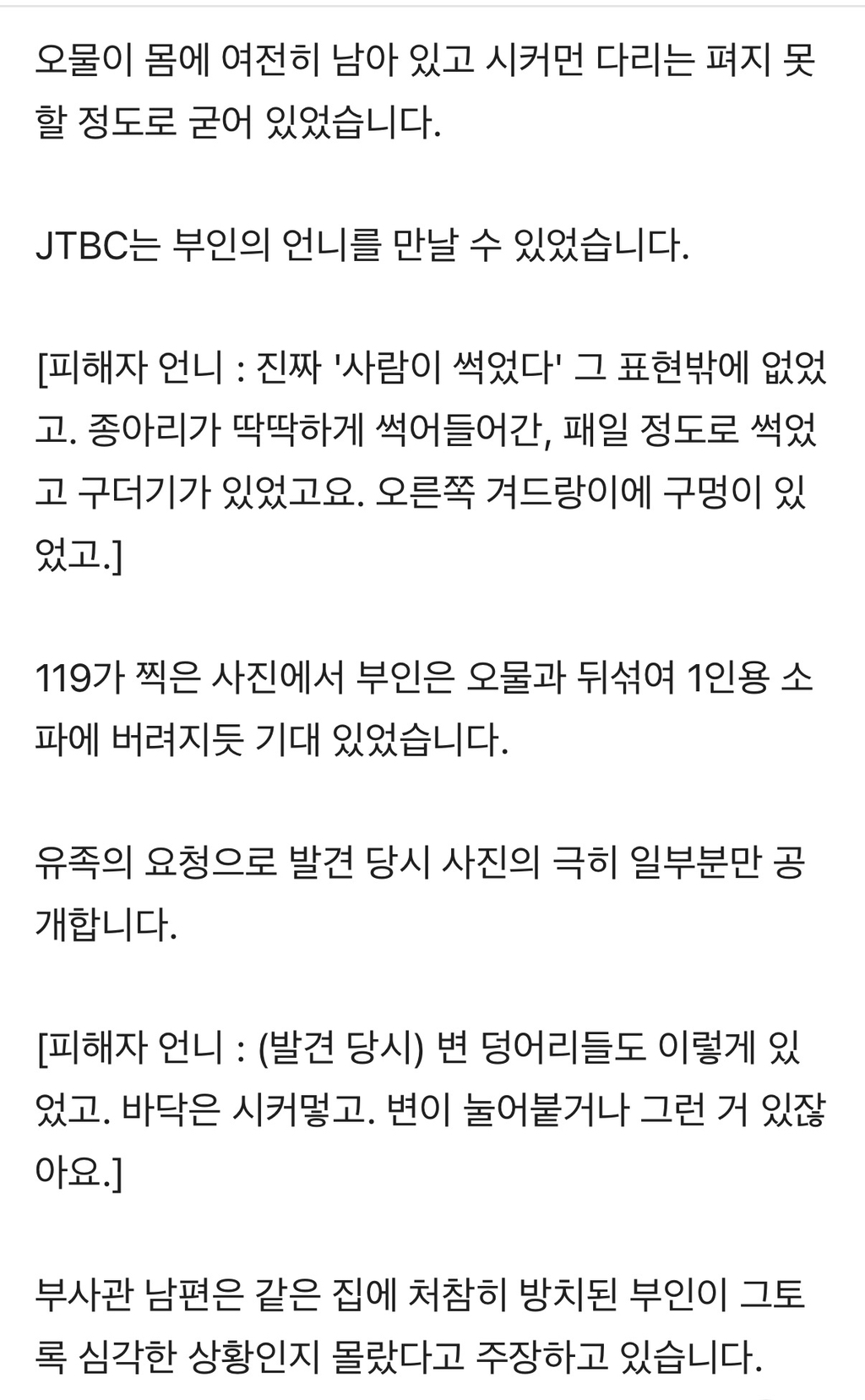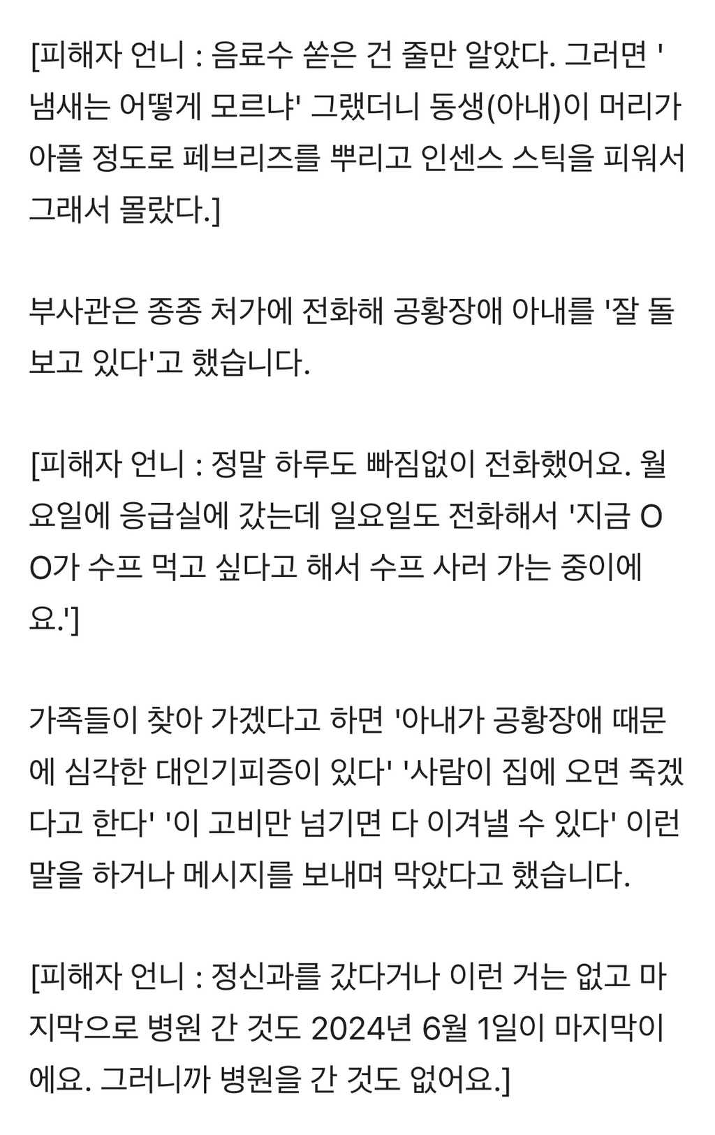 [여시뉴스데스크][단독] '구더기 아내' 방치…"살 썩는데 왜 모르냐" 유족들 사진 공개 작성자머리부터발끝까지한있슈|작성시간25.11.24|조회수56,865 목록 댓글 240 글자크기 작게가 글자크기 크게가 출처: https://v.daum.net/v/20251124193819866 다음검색 현재 게시글 추가 기능 열기 북마크 공유하기 신고 센터로 신고 댓글 댓글 240 댓글쓰기 답글쓰기 댓글 리스트 작성자Doctor Strange | 작성시간 25.11.27 미친 살인자잖아 사람반죽여놓고 방치한거지 작성자고기사랑 | 작성시간 25.12.01 어휴 작성자빨아봐라빨아봐 | 작성시간 17:45 new 신상공개해... 악마도 저렇게는 못해 작성자시간아멈처라 | 작성시간 18:17 new 왤케조용하냐 십ㄹ발진짜 작성자관리비 | 작성시간 1시간 47분 전 new 신상 공개해라 진짜 개미친새끼 댓글 전체보기