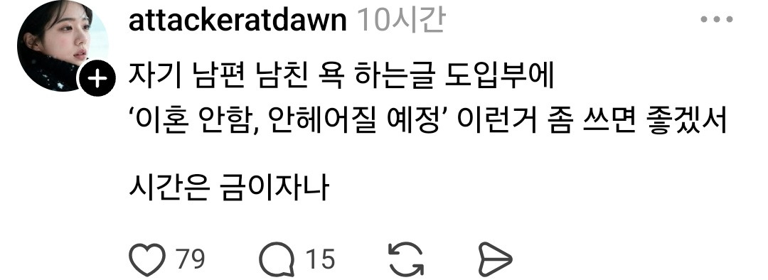 [스크랩] [흥미돋]자기 남편 남친 욕 하는글 도입부에 '이혼 안함, 안헤어질 예정' 이런거 좀 쓰면 좋겠서