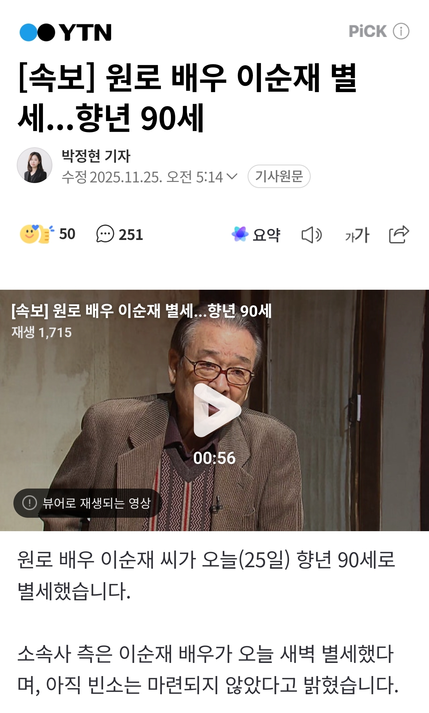 [여시뉴스데스크][속보] 원로 배우 이순재 별세...향년 90세 작성자하늘땅별땅땅땅땅|작성시간25.11.25|조회수104,471 목록 댓글 1,515 글자크기 작게가 글자크기 크게가 출처: https://n.news.naver.com/article/052/0002277772?sid=103[속보] 원로 배우 이순재 별세...향년 90세원로 배우 이순재 씨가 오늘(25일) 향년 90세로 별세했습니다. 소속사 측은 이순재 배우가 오늘 새벽 별세했다며, 아직 빈소는 마련되지 않았다고 밝혔습니다. 함북 회령에서 태어나 서울고와 서n.news.naver.com삼가 고인의 명복을 빕니다 다음검색 현재 게시글 추가 기능 열기 북마크 공유하기 신고 센터로 신고 댓글 댓글 1,515 댓글쓰기 답글쓰기 댓글 리스트 작성자개같이벌어서여행간다 | 작성시간 25.11.29 삼가 고인의 명복을 빕니다. 작성자currently | 작성시간 25.12.03 삼가 고인의 명복을 빕니다 작성자럭키블리 | 작성시간 25.12.03 삼가 고인의 명복을 빕니다 작성자하남시 | 작성시간 25.12.07 삼가 고인의 명복을 빕니다. 작성자따뜻한라떼 | 작성시간 25.12.07 삼가 고인의 명복을 빕니다 댓글 전체보기