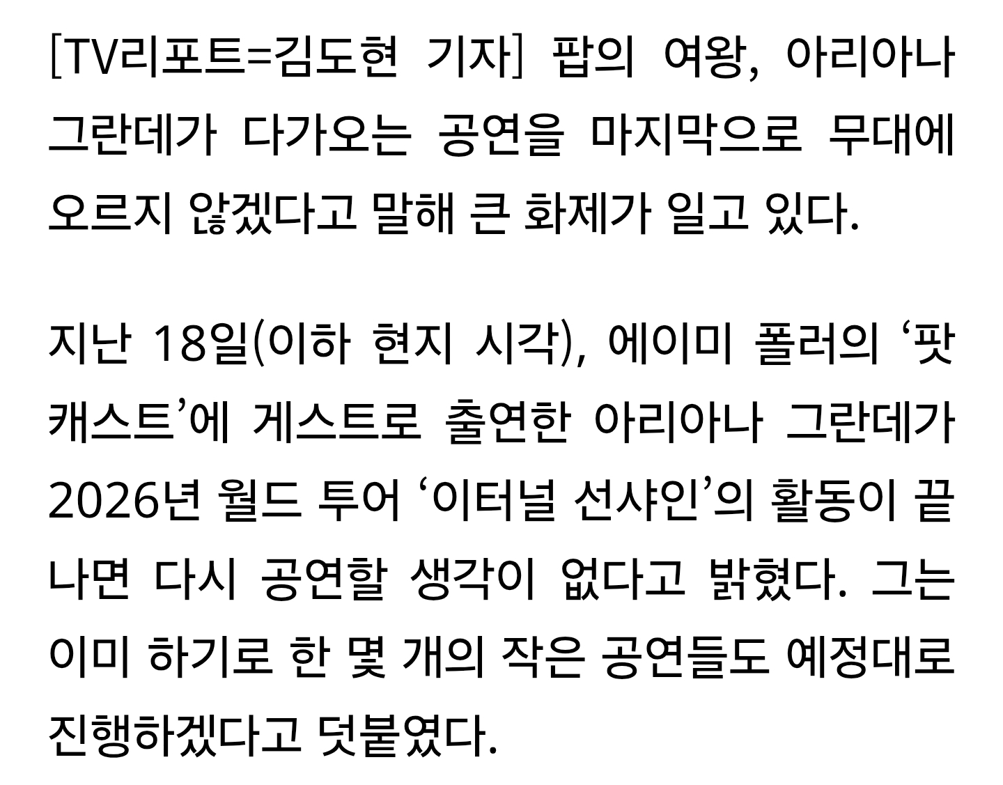[여시뉴스데스크]아리아나 그란데, 돌연 ‘은퇴’ 선언… “이번 투어가 마지막” [할리웃통신] 작성자솜사탕몽글몽글|작성시간25.11.25|조회수29,564 목록 댓글 65 글자크기 작게가 글자크기 크게가 출처: https://www.google.com/amp/s/tvreport.co.kr/world/article/963626/amp/아리아나 그란데, 돌연 '은퇴' 선언… "이번 투어가 마지막" [할리웃통신]팝의 여왕, 아리아나 그란데가 다가오는 공연을 마지막으로 무대에 오르지 않겠다고 말해 큰 화제가 일고 있다. 지난 18일(이하 현지 시각), 에이미 폴러의 ‘팟캐스트’에 게스트로 출연한 아리tvreport.co.kr 다음검색 현재 게시글 추가 기능 열기 북마크 공유하기 신고 센터로 신고 댓글 댓글 65 댓글쓰기 답글쓰기 댓글 리스트 작성자도없살 | 작성시간 25.11.25 내한은 한국은커녕...아시아 아예없네.... 작성자Yuna kim♥ | 작성시간 25.11.25 안돼 내한해줘 안돼!!!!!!!!!!!!!!! 삭제된 댓글입니다. 답댓글 작성자죠물음표 | 작성시간 25.11.25 휴 작성자모쿠렌 | 작성시간 25.11.25 내한은 해줘 아랴아랴....🥲 댓글 전체보기