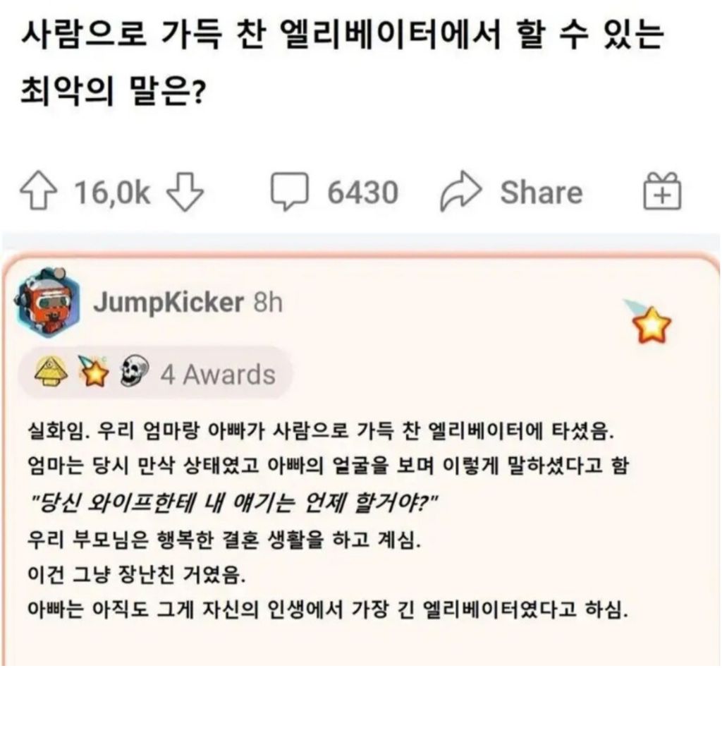 [흥미돋]엘리베이터에서 할 수 있는 최악의 장난 작성자나기봉|작성시간25.11.25|조회수64,134 목록 댓글 28 글자크기 작게가 글자크기 크게가 출처: 여성시대 나기봉 다음검색 현재 게시글 추가 기능 열기 북마크 공유하기 신고 센터로 신고 댓글 댓글 28 댓글쓰기 답글쓰기 댓글 리스트 작성자욕쟁이 | 작성시간 25.11.25 악ㅋㅋㅋㅋㅋㅋㅋㅋㅋㅋㅋㅋㅋㅋㅋㅋㅋㅋㅋㅋㅋㅋㅋ나도 그 엘리베이터 태워줘 작성자아는개 힝 | 작성시간 25.11.25 나 진짜 저기있었으면 조용히 23층 눌렀다 작성자햄스터꼬리곰탕 | 작성시간 25.11.25 왘ㅋㅋㄱㅋㅋㅋㅋㅋㄱㅋ 작성자엥뭐래 | 작성시간 25.11.25 ㅋㅋㅋㅋㅋㅋㅋㅋㅋㅋㅋㅋ 아 작성자냥르장머리 | 작성시간 25.11.25 식은땀 줄줄줄 댓글 전체보기