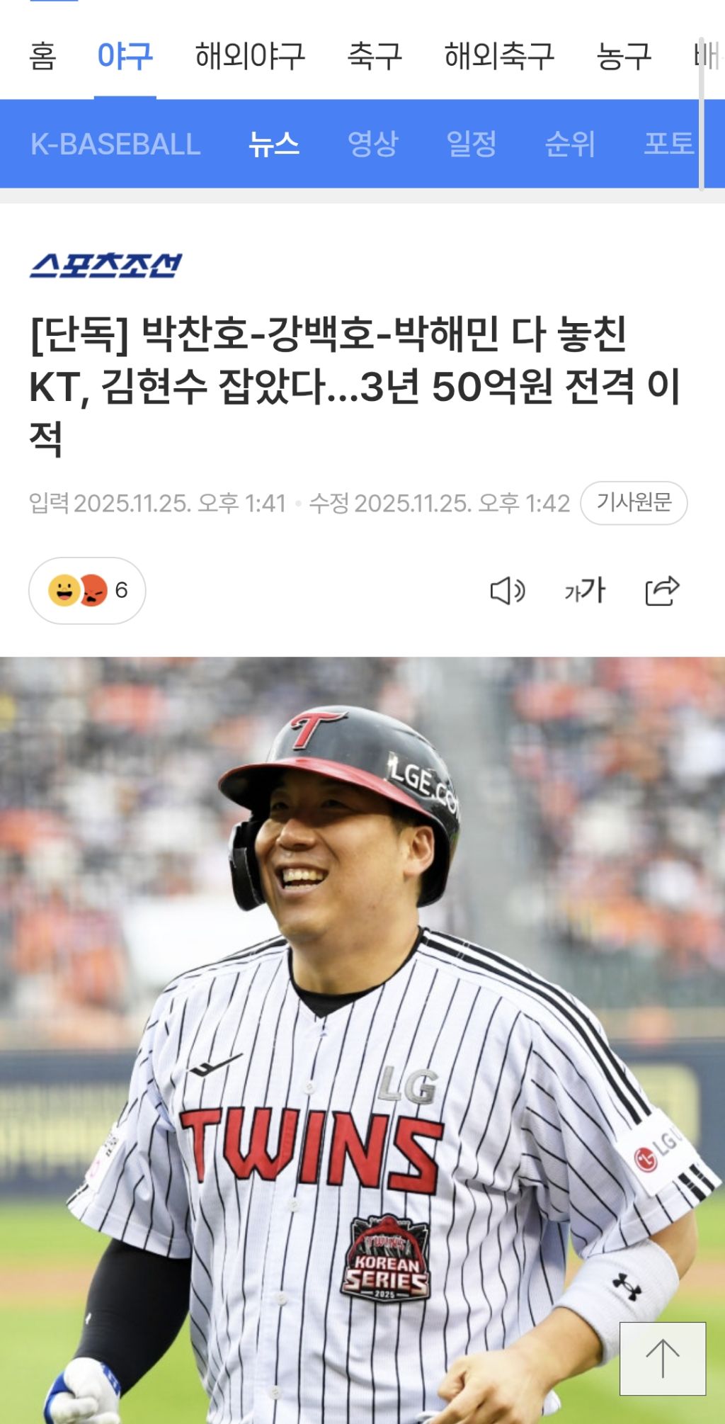 [여시뉴스데스크][단독] 박찬호-강백호-박해민 다 놓친 KT, 김현수 잡았다...3년 50억원 전격 이적 작성자TAEYEON|작성시간25.11.25|조회수19,556 목록 댓글 300 글자크기 작게가 글자크기 크게가 출처: 여성시대 TAEYEONhttps://m.sports.naver.com/kbaseball/article/076/0004350106[단독] 박찬호-강백호-박해민 다 놓친 KT, 김현수 잡았다...3년 50억원 전격 이적여기를 눌러 링크를 확인하세요m.sports.naver.com 다음검색 현재 게시글 추가 기능 열기 북마크 공유하기 신고 센터로 신고 댓글 댓글 300 댓글쓰기 답글쓰기 댓글 리스트 작성자장충동왕죡발보쌈 | 작성시간 25.11.26 솔직히 남을줄알았는데; 작성자무적엘지의승리를위해 | 작성시간 25.11.26 쳇.... 작성자Nobel | 작성시간 25.11.26 와...난 솔직히 말하자면(?) 두산 가는거 아니면 그냥 엘지 남을줄 알았어 내가 알못이긴 한데. 그냥 금액이 문제였구나 작성자우린 진 적이 없다. | 작성시간 25.11.26 헐 작성자ㅈㄱㄷㄷ | 작성시간 25.11.26 하...ㅎㅎㅎㅎㅎ 댓글 전체보기