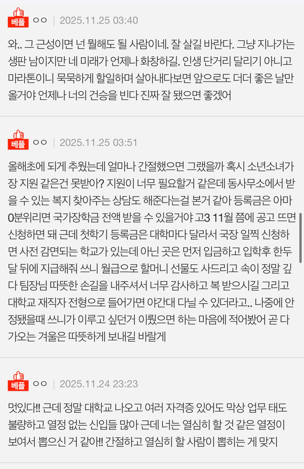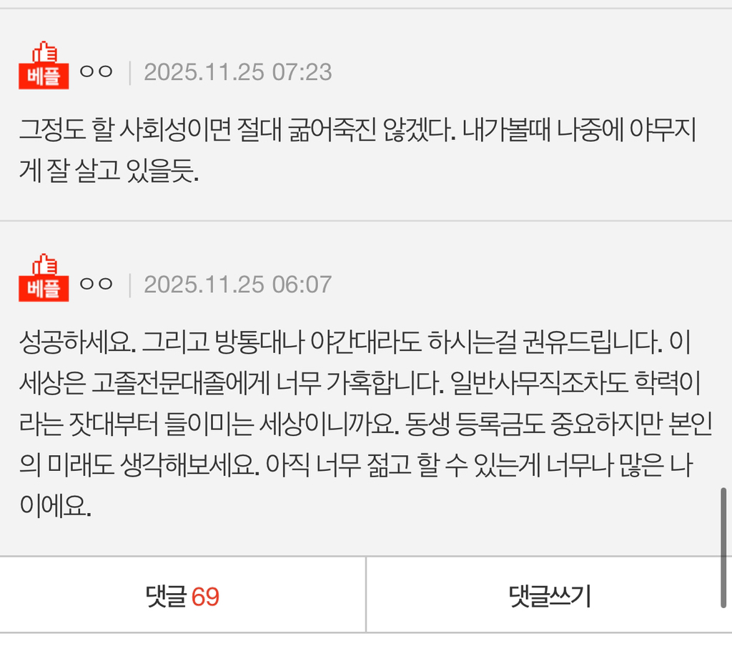 우리집이 좀 많이 가난함 할머니랑 고2 동생이랑 사는데 대학은 못갔고 졸업하자마자 진짜 작은 사무실 들어가서 사무직하다가 월급 계속 밀려서 받고