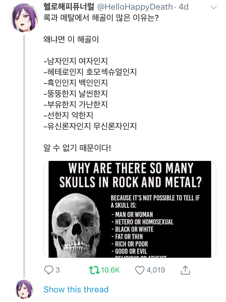 [스크랩] [흥미돋]록 메탈 장르에서 해골이 자주 등장하는 이유 작성자카스 프레쉬|작성시간25.11.25|조회수6,183 목록 댓글 23 글자크기 작게가 글자크기 크게가 미방 헬로해피퓨너럴 on Twitter“록과 메탈에서 해골이 많은 이유는? 왜냐면 이 해골이 -남자인지 여자인지 -헤테로인지 호모섹슈얼인지 -흑인인지 백인인지 -뚱뚱한지 날씬한지 -부유한지 가난한지 -선한지 악한지 -유신론자인지 무신론자인지 알 수 없기 때문이다!”twitter.com 다음검색 스크랩 원문 : 쭉빵카페 현재 게시글 추가 기능 열기 북마크 공유하기 신고 센터로 신고 댓글 댓글 23 댓글쓰기 답글쓰기 댓글 리스트 작성자쭈프 | 작성시간 25.11.25 락붐온🤘 작성자냠냠긋그슿ㄹ | 작성시간 25.11.25 대박 첨알았은스껄~ 작성자가감감 | 작성시간 25.11.25 롹앤롤~ 작성자마이콜 | 작성시간 25.11.25 작성자아무닉네임임 | 작성시간 25.11.26 쿨하다 댓글 전체보기