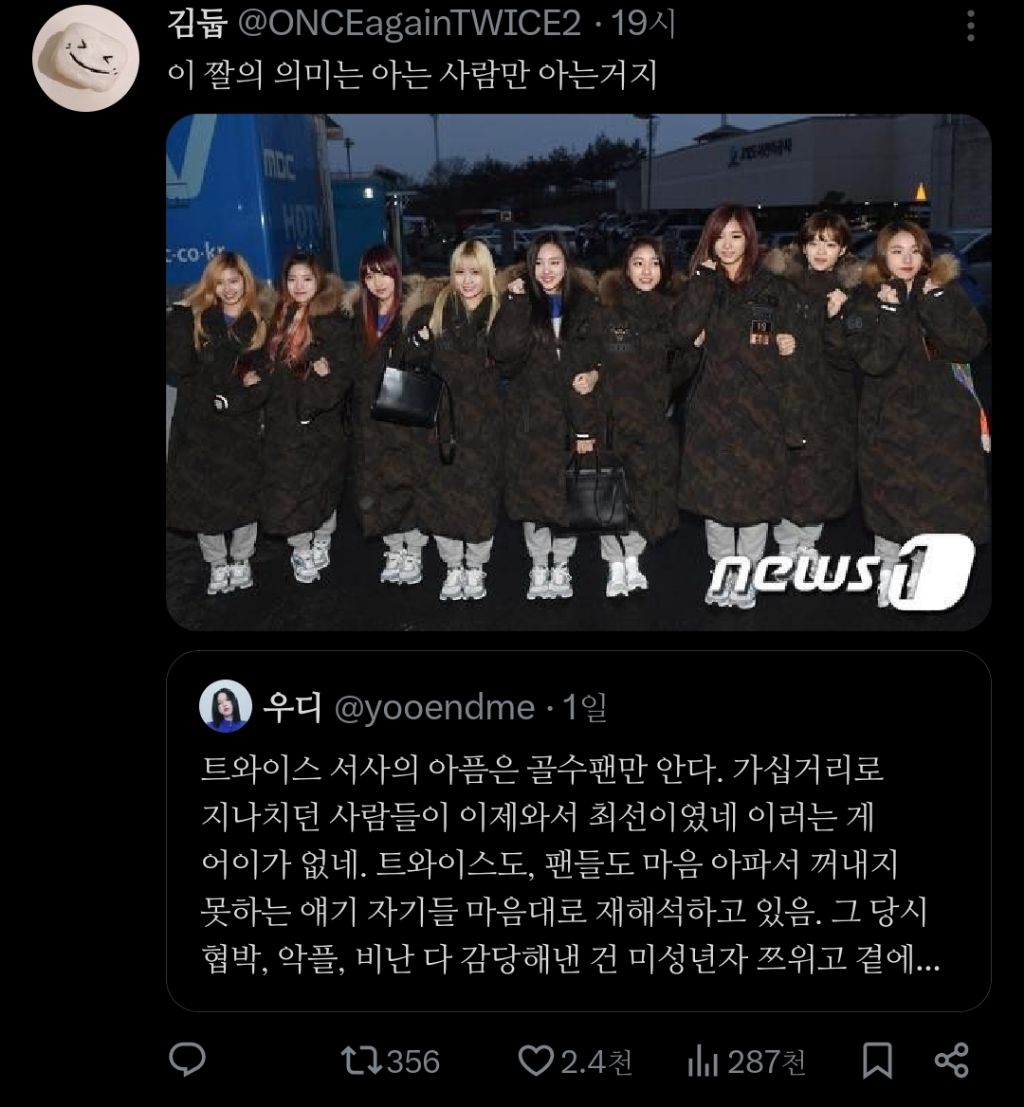 작성자내계요 작성시간 25.11.26 아육대 기억난다 완전..차에서 내려서부터 일렬로 팔짱끼고 입장했던거 쯔위 양 옆에 지효랑 정연이 있어서 든든하겠다 싶었음..