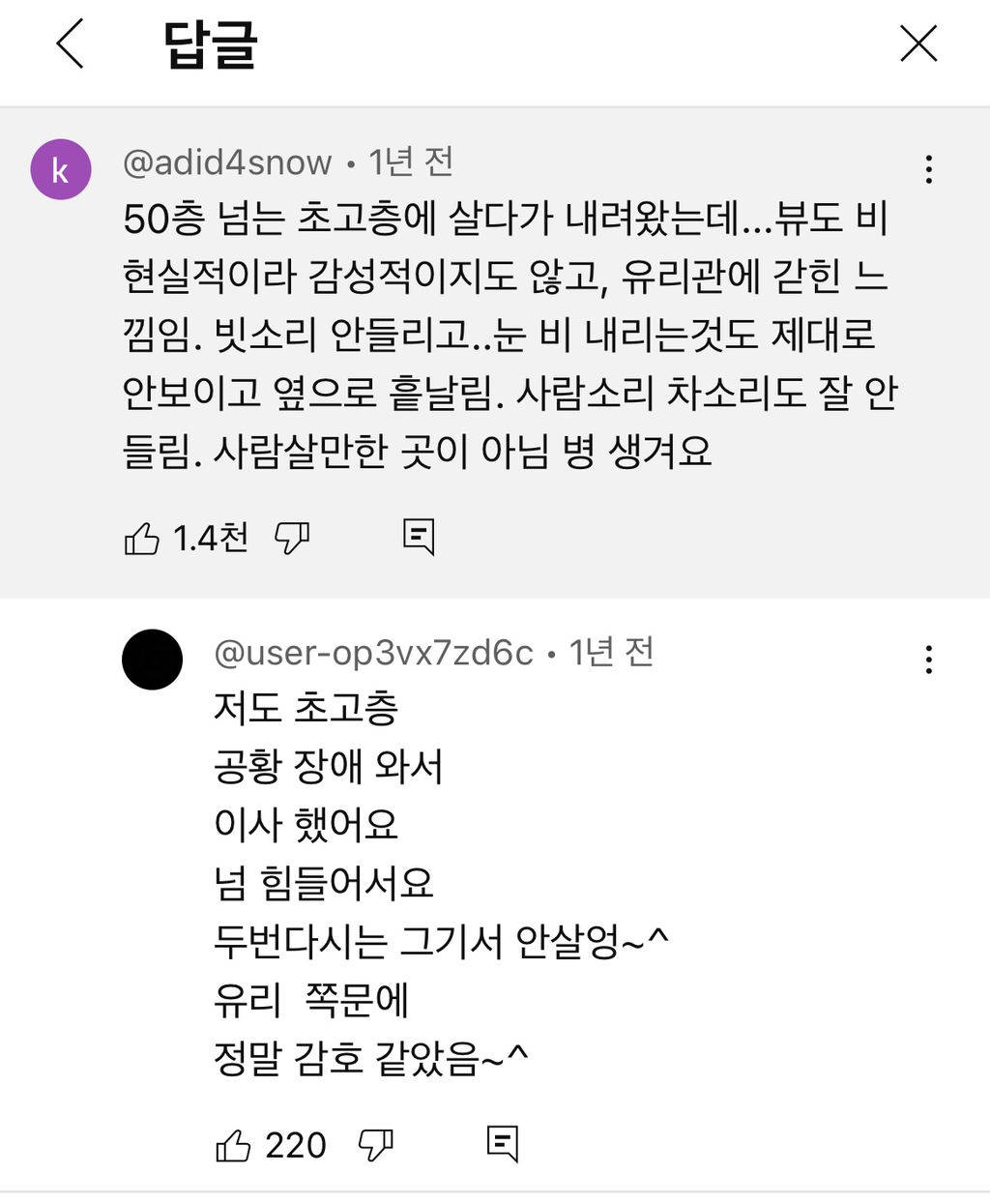 작성자청와대돌려내 작성시간 25.11.26 얼마전에 부산여행가서 38층에 묵었는데 귀가 자꾸 막히는거임 비행기도 아닌데;; 엘베에서 슝 올라가는 그 느낌이 숙소에서도 계속 느껴져서 너무 불편했던 기억남 ㅠ