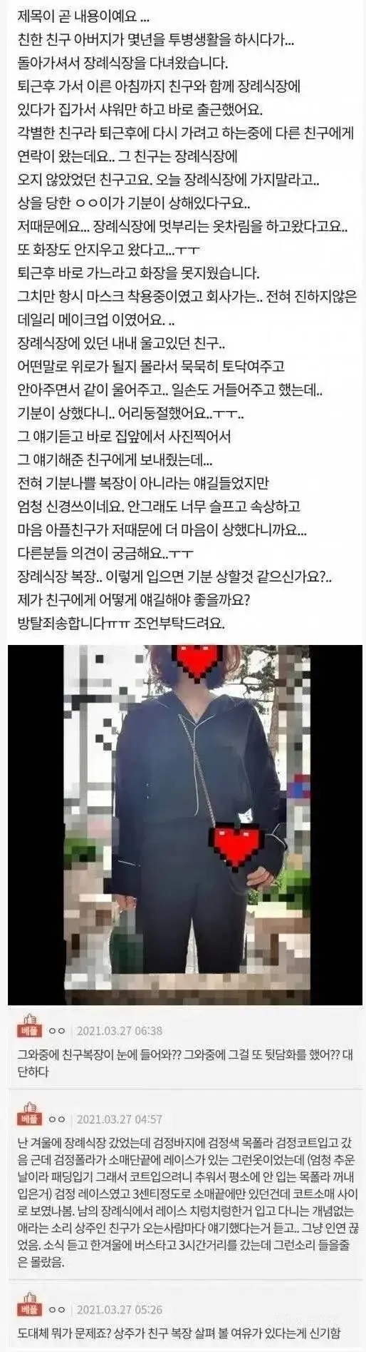 작성자느개비 코스트코 양파도둑 작성시간 25.11.26 우리집에서 상치룰때도 등산복 퇴근복장으로 겸언쩍게 오신 분들 많았는데 다 감사하고 고맙고 밥이라도 드시고 가시라고 잡고 그랬음.... 나도 퇴근하고 바로 가는 바람에 차로 왕복 두시간거리 회색 후드에 청바지였는데도 와줘서 고맙다고 들어갈때 한번 밥먹을때 한번 집갈때 한번 더 들었고...진짜 와주면 감사한게 초상인데 무슨 그와중에 복장타령을.... 주변사람 복장터지는 소리하고있네... 저러고 다니면 주변사람들 에고 가족 상치르느라 제정신이 아닌가봐 쉬쉬해서 그렇지 본인 얼굴에 침뱉는짓이야 ㄱㅊㄱㅊ
