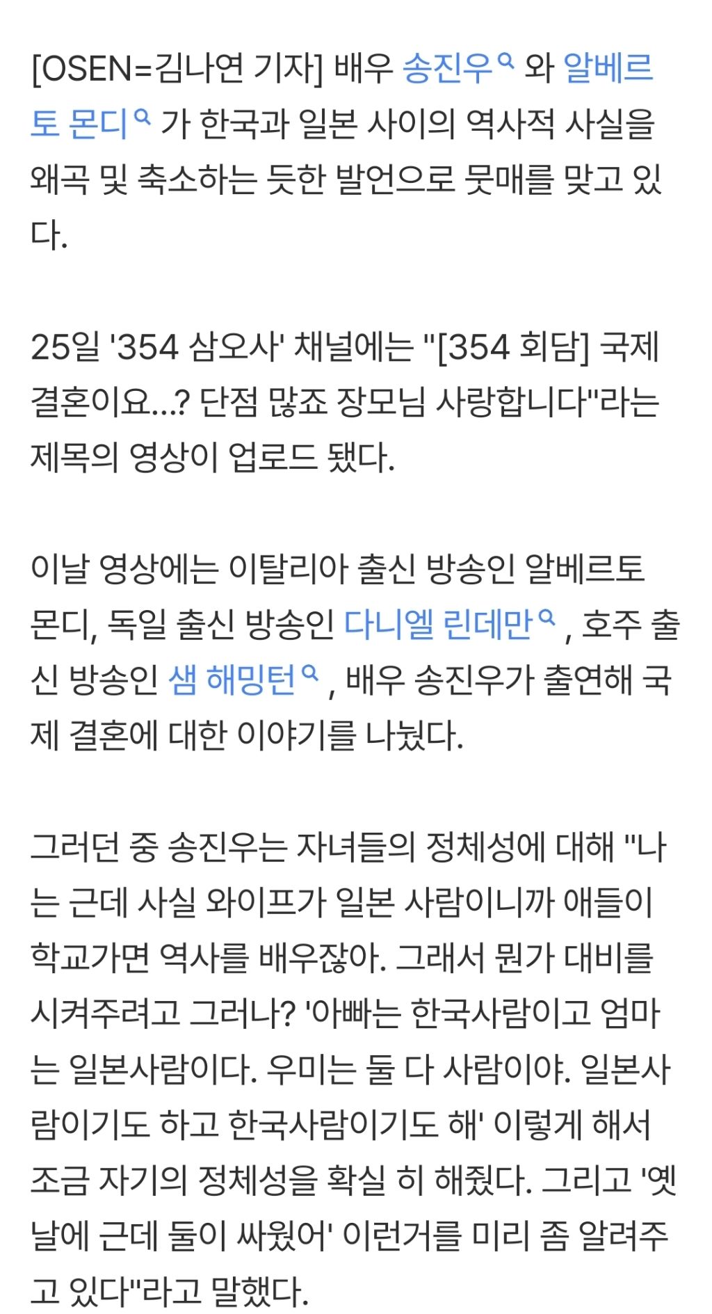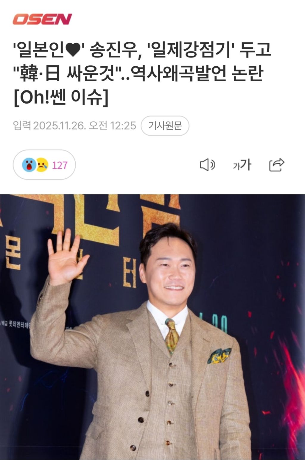 [여시뉴스데스크]'일본인♥' 송진우, '일제강점기' 두고 "韓·日 싸운것"..역사왜곡발언 논란[Oh!쎈 이슈] 작성자열받게하지마라|작성시간25.11.26|조회수67,902 목록 댓글 396 글자크기 작게가 글자크기 크게가 출처: https://naver.me/FxCAQszX'일본인♥' 송진우, '일제강점기' 두고 "韓·日 싸운것"..역사왜곡발언 논란[Oh!쎈 이슈]여기를 눌러 링크를 확인하세요link.naver.com중략기사뜸 전문은 출처 다음검색 현재 게시글 추가 기능 열기 북마크 공유하기 신고 센터로 신고 댓글 댓글 396 댓글쓰기 답글쓰기 댓글 리스트 작성자류승롱 | 작성시간 25.11.26 독도 얘기도 참.. 일본인은 관심없는데 한국인은 유난이다 처럼 들리네 작성자아이스아메리카노시럽추가 | 작성시간 25.11.27 미친건가 작성자브맅 | 작성시간 25.11.27 좃본인이랑 결혼한 한국남..례 작성자강아지채고 | 작성시간 25.11.27 양쪽 얘기 이러고 있네;; 작성자뜌어 | 작성시간 25.12.05 디질라고 댓글 전체보기