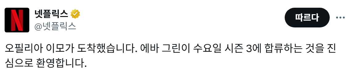 [흥미돋]넷플릭스 웬즈데이 시즌3 이모역 배우 공개 작성자귤토끼이|작성시간25.11.26|조회수31,688 목록 댓글 30 글자크기 작게가 글자크기 크게가 출처: https://theqoo.net/square/4006141148https://x.com/netflix/status/1993355250581852665 에바 그린 다음검색 현재 게시글 추가 기능 열기 북마크 공유하기 신고 센터로 신고 댓글 댓글 30 댓글쓰기 답글쓰기 댓글 리스트 작성자옥탑방지곰이 | 작성시간 25.11.26 헐!!!! 너무 좋아 작성자피포포피 | 작성시간 25.11.26 찰떡..! 작성자연예인 찬양 좀 그만해 | 작성시간 25.11.26 너무 잘 어울림 ㄹㅇ ㅋㅋㅋㅋㅋㅋㅋㅋㅋㅋㅋㅋㅋ 작성자셰르파 | 작성시간 25.11.26 헐 미친 작성자아이유여친 | 작성시간 25.11.26 ㅁㅊ 개조아 댓글 전체보기