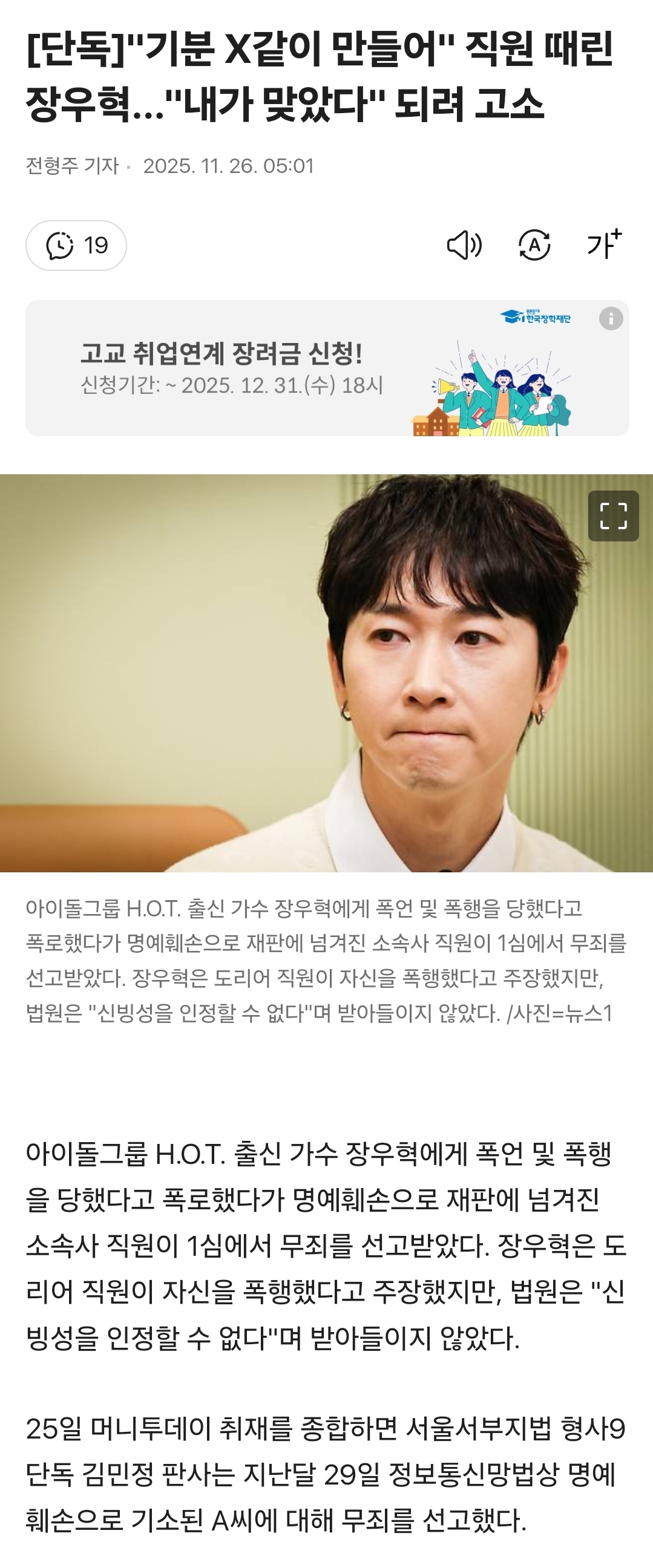 [여시뉴스데스크][단독]"기분 X같이 만들어" 직원 때린 장우혁..."내가 맞았다" 되려 고소 작성자고운손고운발|작성시간25.11.26|조회수50,190 목록 댓글 220 글자크기 작게가 글자크기 크게가 출처: https://v.daum.net/v/20251126050149997 ... 전문은 출처로.. 다음검색 현재 게시글 추가 기능 열기 북마크 공유하기 신고 센터로 신고 댓글 댓글 220 댓글쓰기 답글쓰기 댓글 리스트 작성자nonymous | 작성시간 25.11.27 진짜 40넘으면 인상에 드러남ㅋㅋ 작성자소방서옆경찰청창살쇠창살 | 작성시간 25.11.28 와 최악 작성자요즘너무지쳐 | 작성시간 25.11.30 어휴 작성자고양이 뒷간 갔는데요 | 작성시간 25.11.30 쓰레기네 작성자니나니나니내내나 | 작성시간 25.11.30 악독하내 댓글 전체보기