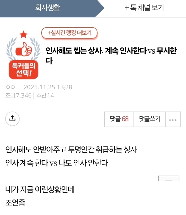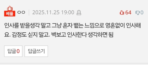 작성자이직러 작성시간 25.11.26 꼭집어서 과장님 안녕하세요~라고 눈 마주치고 인사함