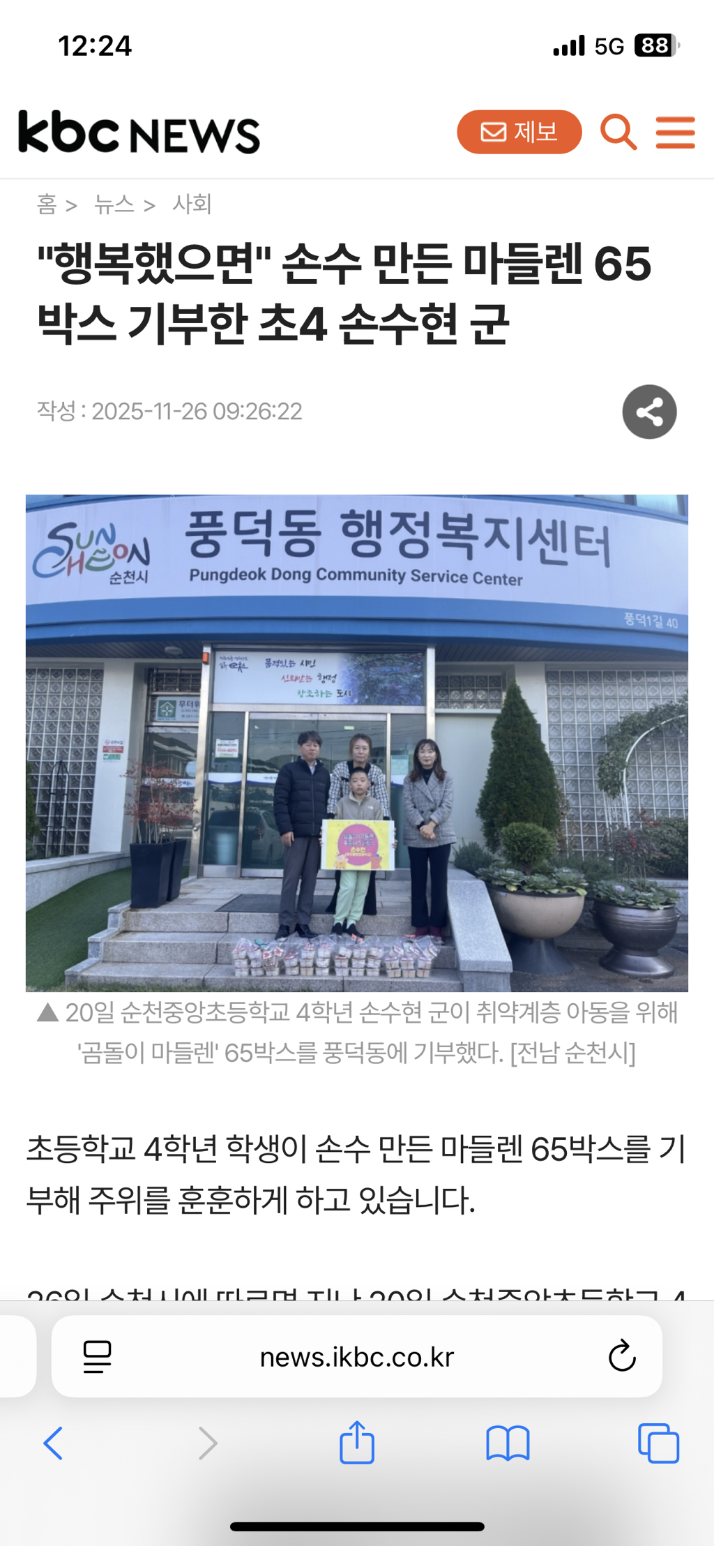 26일 순천시에 따르면 지난 20일 순천중앙초등학교 4학년 손수현 군이 취약계층 아동을 위해 '곰돌이 마들렌' 65박스를 풍덕동에 기부했습니다.