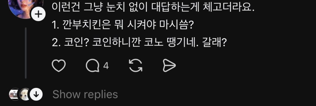 작성자뵥뵥 작성시간 25.11.26 ㄹㅇ저런사람들한텐그냥 우왕 깐부치킨 마쉿겟다 쳡쳡 ~ 해야됨