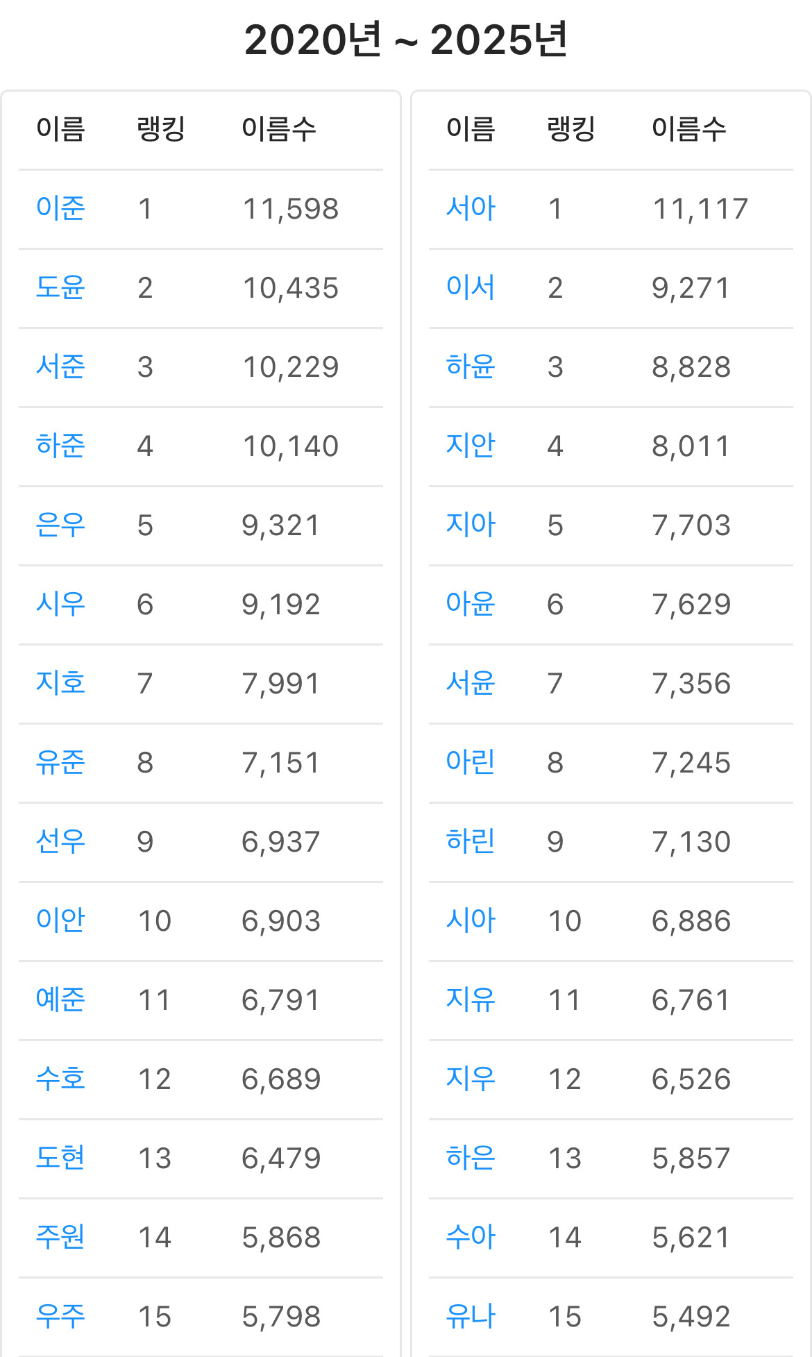 작성자으아게기안 작성시간 25.11.27 내이름 항상 순위권..내또래 보다 애기들이 더 많아서 신기하더라