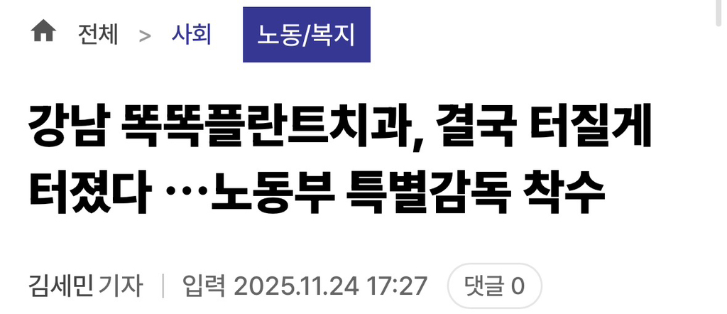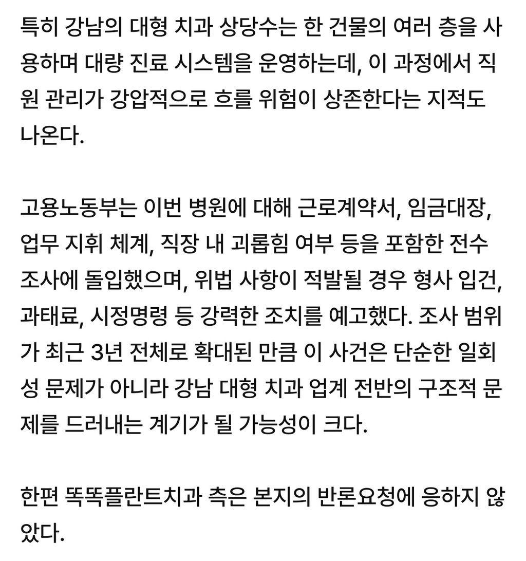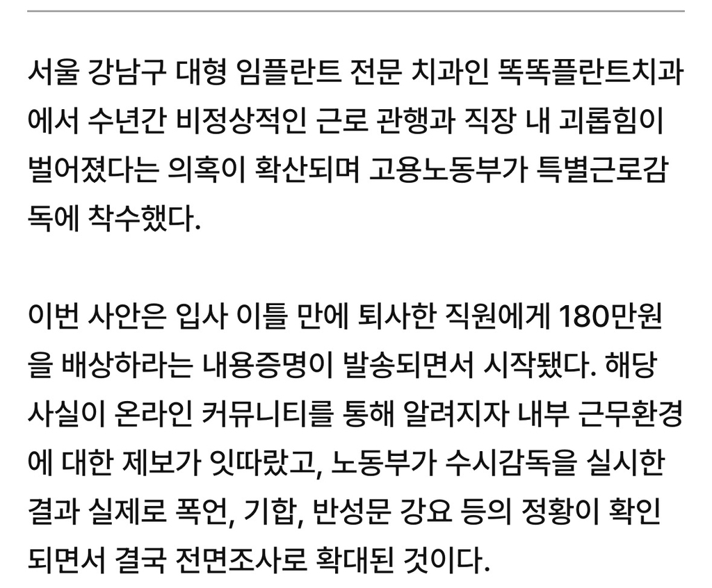 [칵.cxxx]강남 똑똑플란트치과, 결국 터질게 터졌다 …노동부 특별감독 착수 작성자이런건방진|작성시간25.11.26|조회수60,496 목록 댓글 40 글자크기 작게가 글자크기 크게가 출처: https://wemakenews.co.kr/news/view.php?no=23813강남 똑똑플란트치과, 결국 터질게 터졌다 …노동부 특별감독 착수 - 위메이크뉴스서울 강남구 대형 임플란트 전문 치과인 똑똑플란트치과에서 수년간 비정상적인 근로 관행과 직장 내 괴롭힘이 벌어졌다는 의혹이 확산되며 고용노동부가wemakenews.co.kr중략MBC뉴스https://youtu.be/TTyPxEs7A3o?si=ai71Pxclq2R2Ru60 다음검색 현재 게시글 추가 기능 열기 북마크 공유하기 신고 센터로 신고 댓글 댓글 40 댓글쓰기 답글쓰기 댓글 리스트 작성자공부해라 그건너무뻔하잔아 | 작성시간 25.11.27 와 걍 노동법 자문 해주는 사람이 없었나 싶을 정도로 문제될게 개많다 ㅋㅋㅋㅋㅋ 작성자윤피그뒤짐 | 작성시간 25.11.27 진심 더 알려지길ㅜㅜ환자들도 피해많이봄.. 답댓글 작성자윤피그뒤짐 | 작성시간 25.11.27 와 이치과 리뷰 다 지움 ㄷㄷ 작성자허거덩거덩엉스 | 작성시간 25.12.22 헐 나여기다녔었는디.. 작성자복동이짱조아 | 작성시간 25.12.28 와 이런데가 다있다니;;; 댓글 전체보기